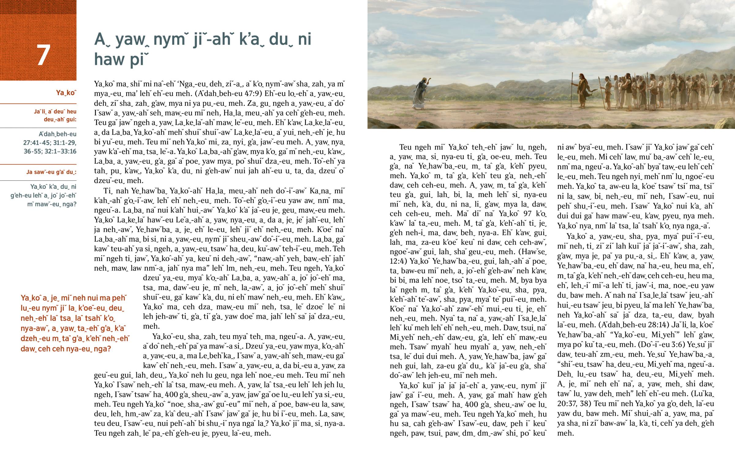 Yaˬkoˆ˗euˬ shaˬ zahˬ teu myaˆ tehꞈ maˬ ngeuˇ˗a. Aˬ yawꞈ˗euˬ aˇ doˆ nehˬ˗ehˇ paˇ ya mawˇ˗a siˬ. Dzeuˇ yaꞈ˗euˬ yaw myaˬ kʼoꞈ˗ahˇ aˬ yawꞈ˗euˬ aˬ ma Leˬbehˇkaꞈ, Iˇsawˇ aˬ yawꞈ˗ahˇ sehꞈ mawꞈ˗eu gaˇ kawˆ ehˇ nehˬ˗euˬ meh. Iˇsawˇ aˬ yawꞈ˗euˬ aˬ da biꞈ˗eu aˬ yawꞈ za geuˇ˗eu guiˬ lahˬ deuˬ, Yaˬkoˆ neh lu geuꞈ nga lehˇ noeˬ˗eu meh. Teu miˇ neh Yaˬkoˆ Iˇsawˇ nehˬ˗ehˇ laˆ tsaˬ mawꞈ˗eu meh. Aˬ yawꞈ laˆ tsaˬ˗eu lehˇ leh jeh luꞈ ngeh, Iˇsawˇ tsawˇ haˬ 400 gʼaˬ sheuˬ˗awˇ aˬ yawꞈ jawˇ gaˇ oe luꞈ˗eu lehˇ ya siˬ˗euˬ meh. Teu ngeh Yaˬkoˆ “noeˬ shaˬ˗awˇ guˆ˗eu” miˇ neh, aˇ poeˬ baw˗eu laꞈ sawˬ deuˬ lehˬ hmˬ˗awˇ zaˬ kʼaˆ deuˬ˗ahˇ Iˇsawˇ jawˇ gaˇ jeˬ hu bi iˇ˗euˬ meh. Laꞈ sawˬ teu deuˬ Iˇsawˇ˗euˬ nui pehˇ˗ahˇ bi shuꞈ˗iˇ nya ngaˇ laˬ? Yaˬkoˆ jiˇ maˬ siˬ nya˗a. Teu ngeh zahˬ leˇ paˬ˗ehˇ gʼeh˗eu jeˬ pyeuꞈ laˇ˗euˬ meh.