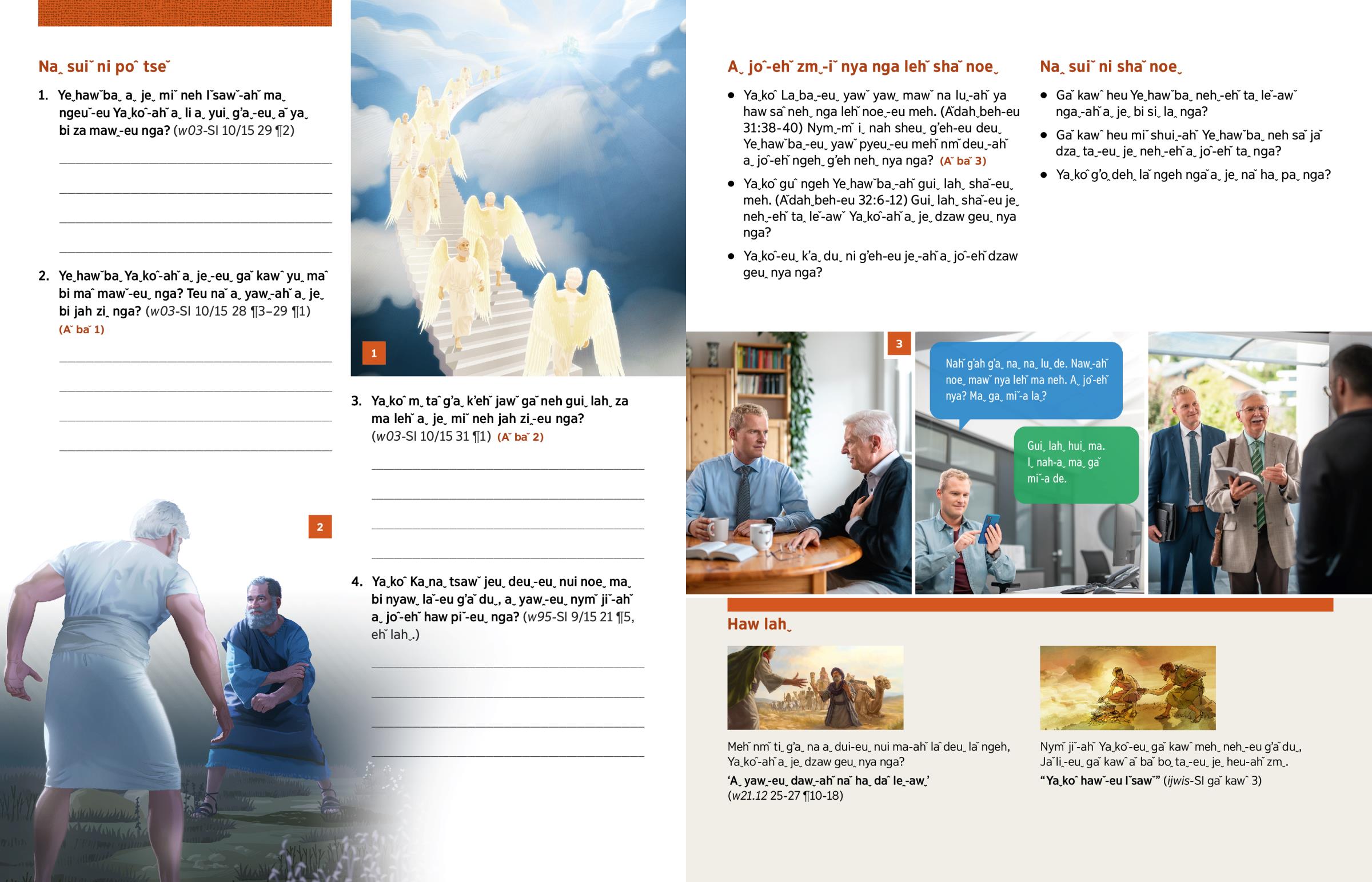 2. Yeˬhawˇbaˬ Yaˬkoˆ˗ahˇ aˬ jeˬ˗euˬ gaˇ kawˆ yuꞈ maˆ bi maˆ mawˇ˗euˬ nga? Teu naˇ aˬ yawꞈ˗ahˇ aˬ jeˬ bi jah ziꞈ nga? (w03-SI 10/15 28 ¶3–29 ¶1) (Aˇ baˇ 1)