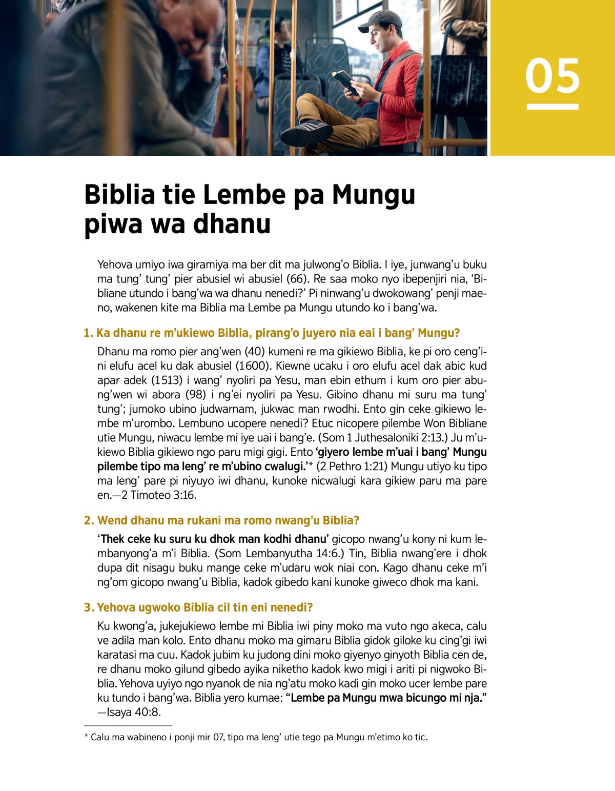 Wakenen kawoni lembe mange ma bimedo ng’eyong’ec peri iwi kite ma Mungu utelo ko wi dhanu kara gikiew Biblia, kite m’egwoko ko Bibliane, man kite m’enyaye ko pi dhanu ceke.