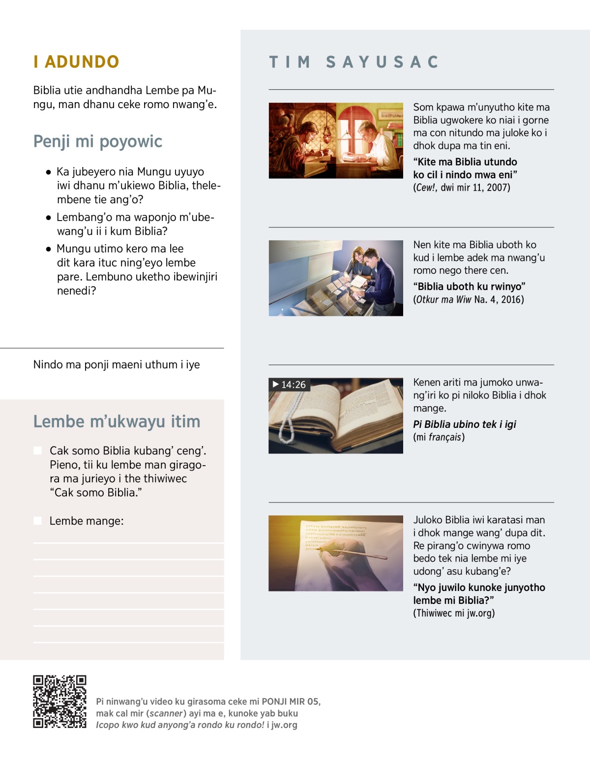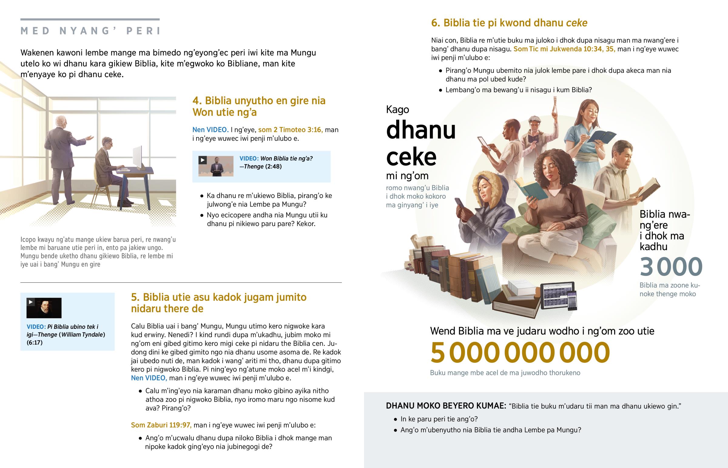 Calu Biblia uai i bang’ Mungu, Mungu utimo kero nigwoke kara kud erwiny. Nenedi? I kind rundi dupa m’ukadhu, jubim moko mi ng’om eni gibed gitimo kero migi ceke pi nidaru the Biblia cen. Judong dini ke gibed gimito ngo nia dhanu usome asoma de. Re kadok jai ubedo nuti de, man kadok i wang’ ariti mi tho, dhanu dupa gitimo kero pi nigwoko Biblia. Pi ning’eyo ng’atune moko acel m’i kindgi, Nen VIDEO, man i ng’eye wuwec iwi penji m’ulubo e.