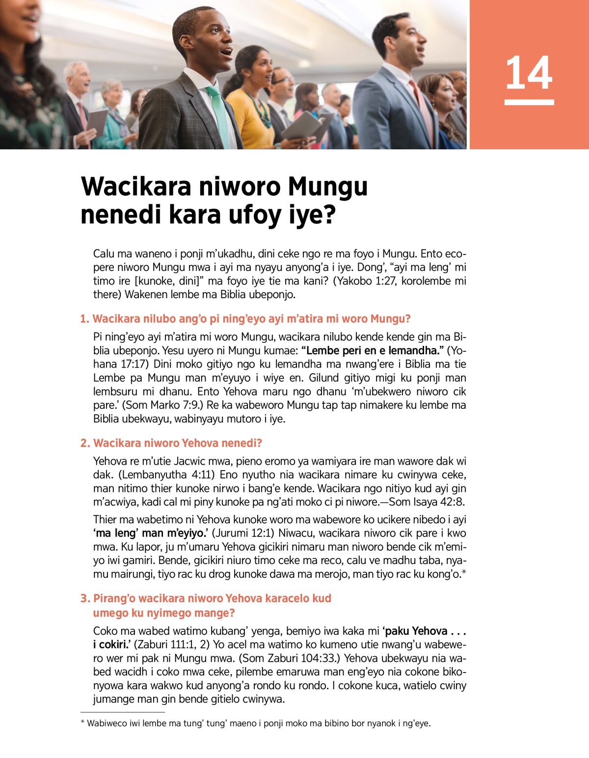 Pi ning’eyo ayi m’atira mi woro Mungu, wacikara nilubo kende kende gin ma Biblia ubeponjo. Yesu uyero ni Mungu kumae: “Lembe peri en e lemandha.” (Yohana 17:17) Dini moko gitiyo ngo ku lemandha ma nwang’ere i Biblia ma tie Lembe pa Mungu man m’eyuyo i wiye en. Gilund gitiyo migi ku ponji man lembsuru mi dhanu. Ento Yehova maru ngo dhanu ‘m’ubekwero niworo cik pare.’ (Som Marko 7:9.) Re ka wabeworo Mungu tap tap nimakere ku lembe ma Biblia ubekwayu, wabinyayu mutoro i iye.