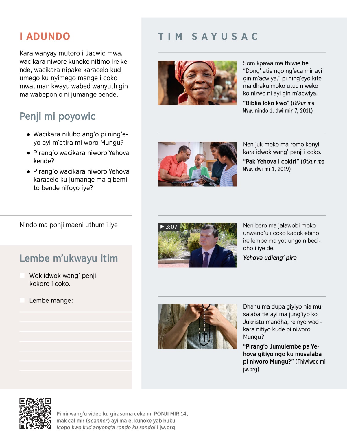 Calu ma waneno i ponji m’ukadhu, dini ceke ngo re ma foyo i Mungu. Ento ecopere niworo Mungu mwa i ayi ma nyayu anyong’a i iye. Dong’, “ayi ma leng’ mi timo ire [kunoke, dini]” ma foyo iye tie ma kani? (Yakobo 1:27, korolembe mi there) Wakenen lembe ma Biblia ubeponjo.