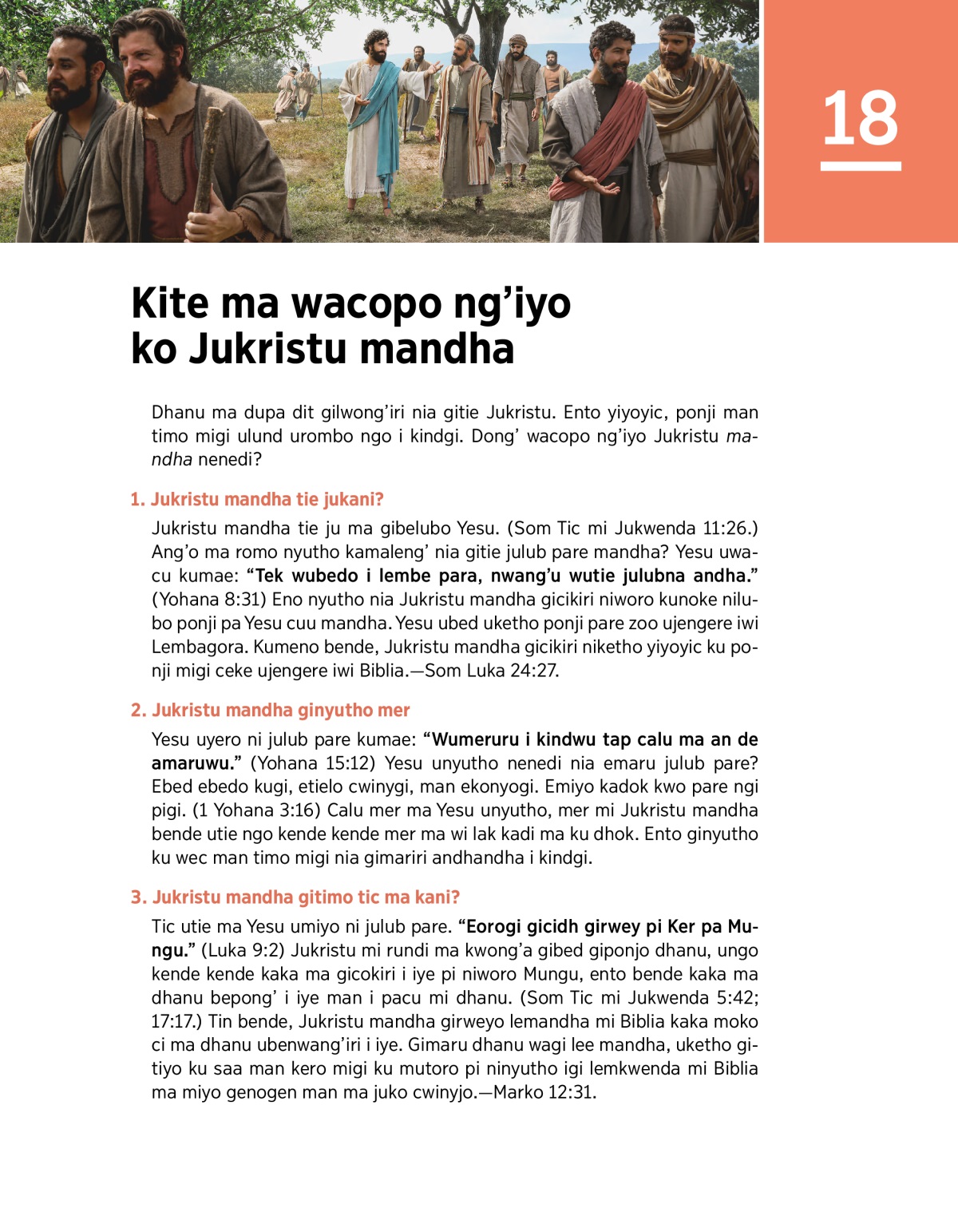 Jukristu mandha tie ju ma gibelubo Yesu. (Som Tic mi Jukwenda 11:26.) Ang’o ma romo nyutho kamaleng’ nia gitie julub pare mandha? Yesu uwacu kumae: “Tek wubedo i lembe para, nwang’u wutie julubna andha.” (Yohana 8:31) Eno nyutho nia Jukristu mandha gicikiri niworo kunoke nilubo ponji pa Yesu cuu mandha. Yesu ubed uketho ponji pare zoo ujengere iwi Lembagora. Kumeno bende, Jukristu mandha gicikiri niketho yiyoyic ku ponji migi ceke ujengere iwi Biblia.—Som Luka 24:27.