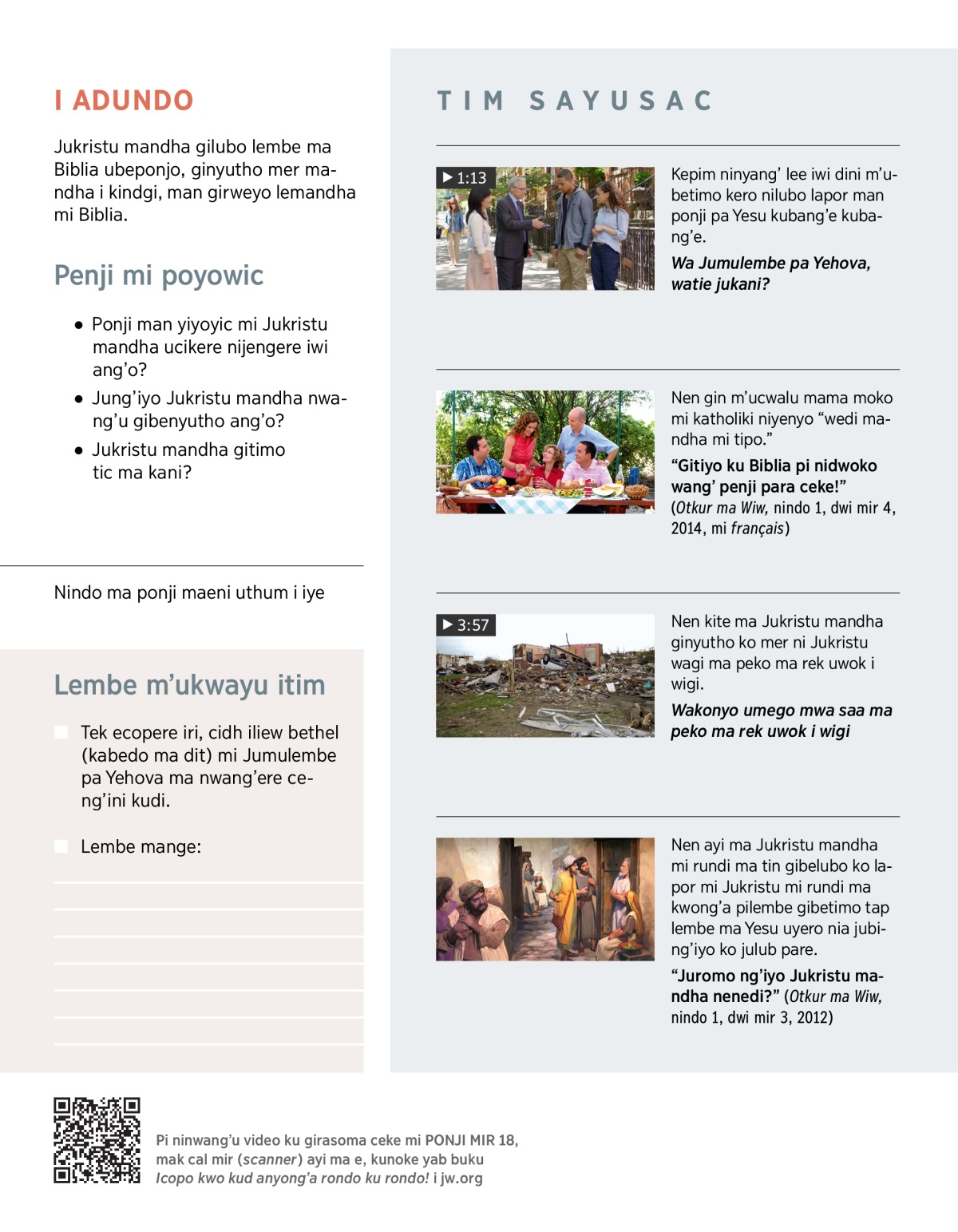 Dhanu moko giloko nia gitie Jukristu, ento gilund giyenyo ngo lemandha i Biblia man gitiyo de ngo kude. Nen VIDEO, man i ng’eye wuwec iwi penji m’ulubo e: