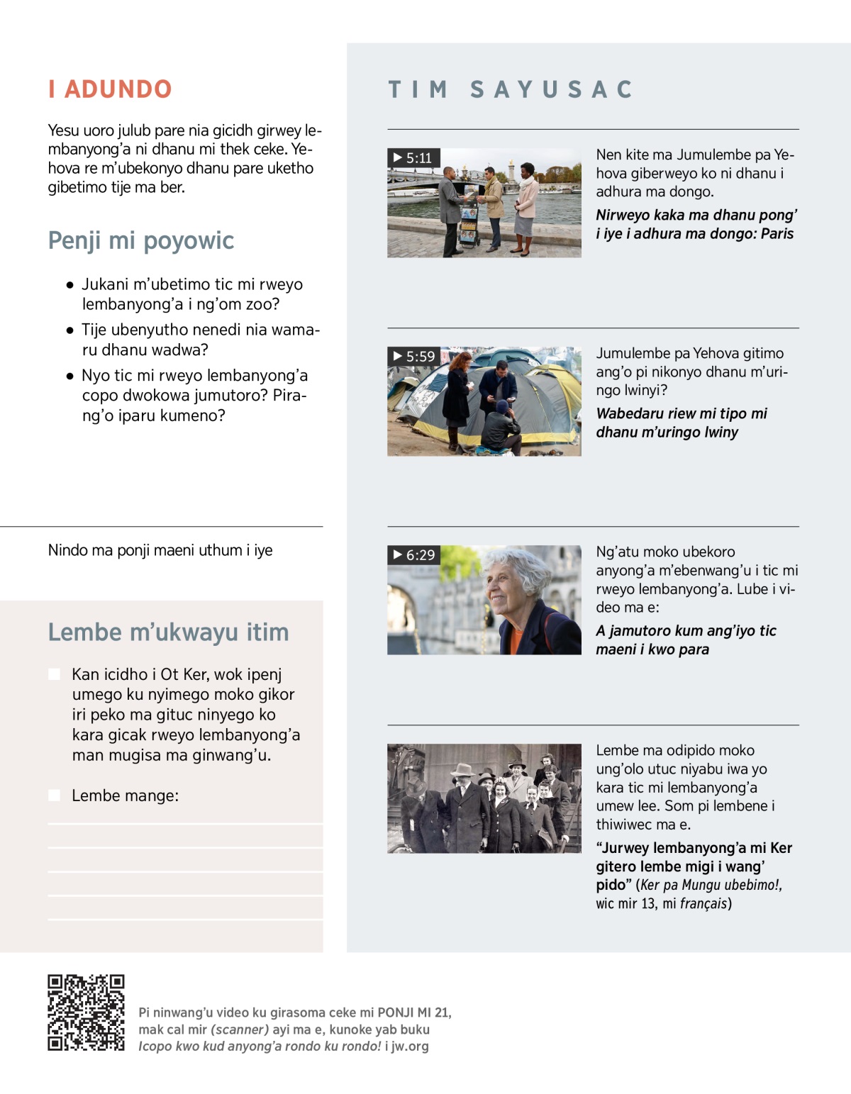 Yesu ular uyero kumae: “Man lembanyong’a maeni mi Ker jubirweyo i ng’om zoo.” (Matayo 24:14) Wa Jumulembe pa Yehova wabetimo tic maeno ma pire tek lee ku mutoro man kud amora. Waberweyo lembanyong’a i ng’om zoo, ke i dhok ma tung’ tung’ elufu acel (1 000) ku wiye! Calu etie tic ma dwong’, ebecuku kwayu saa ku kero ma lee man pangulembe ma cuu. Bende, ka ku kony pa Yehova ngo, nwang’u tije romo timere ngo.