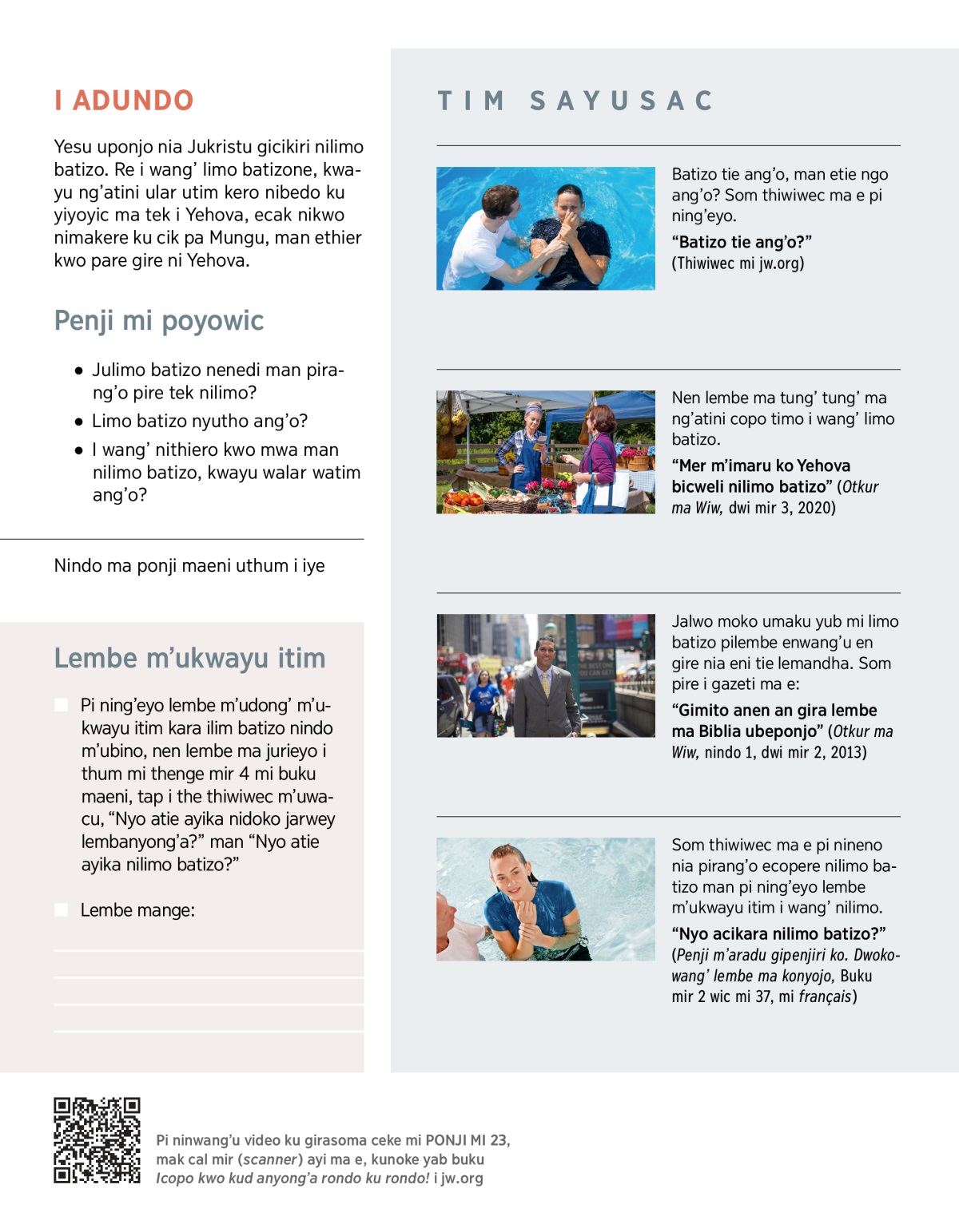 Ku kwong’a, nithiero kwo ni Yehova man nilimo batizo copo nen ni lembe ma pek akeca. Re, nok nok kan ibemediri niponjo lembe iwi Yehova man ibeng’eye cuu, ibigam nwang’u nia itie ayika nimaku yub maeno ma pire tek. Dhanu moko de nuti ma gitimo kumeno. Pi ning’eyo ju moko m’i kindgi, nen VIDEO.