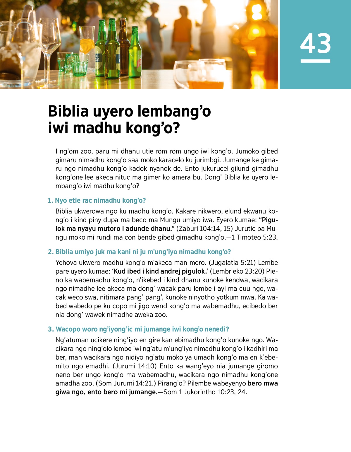 Yehova ukwero madhu kong’o m’akeca man mero. (Jugalatia 5:21) Lembe pare uyero kumae: ‘Kud ibed i kind andrej pigulok.’ (Lembrieko 23:20) Pieno ka wabemadhu kong’o, n’ikebed i kind dhanu kunoke kendwa, wacikara ngo nimadhe lee akeca ma dong’ wacak paru lembe i ayi ma cuu ngo, wacak weco swa, nitimara pang’ pang’, kunoke ninyotho yotkum mwa. Ka wabed wabedo pe ku copo mi jigo wend kong’o ma wabemadhu, ecibedo ber nia dong’ wawek nimadhe aweka zoo.