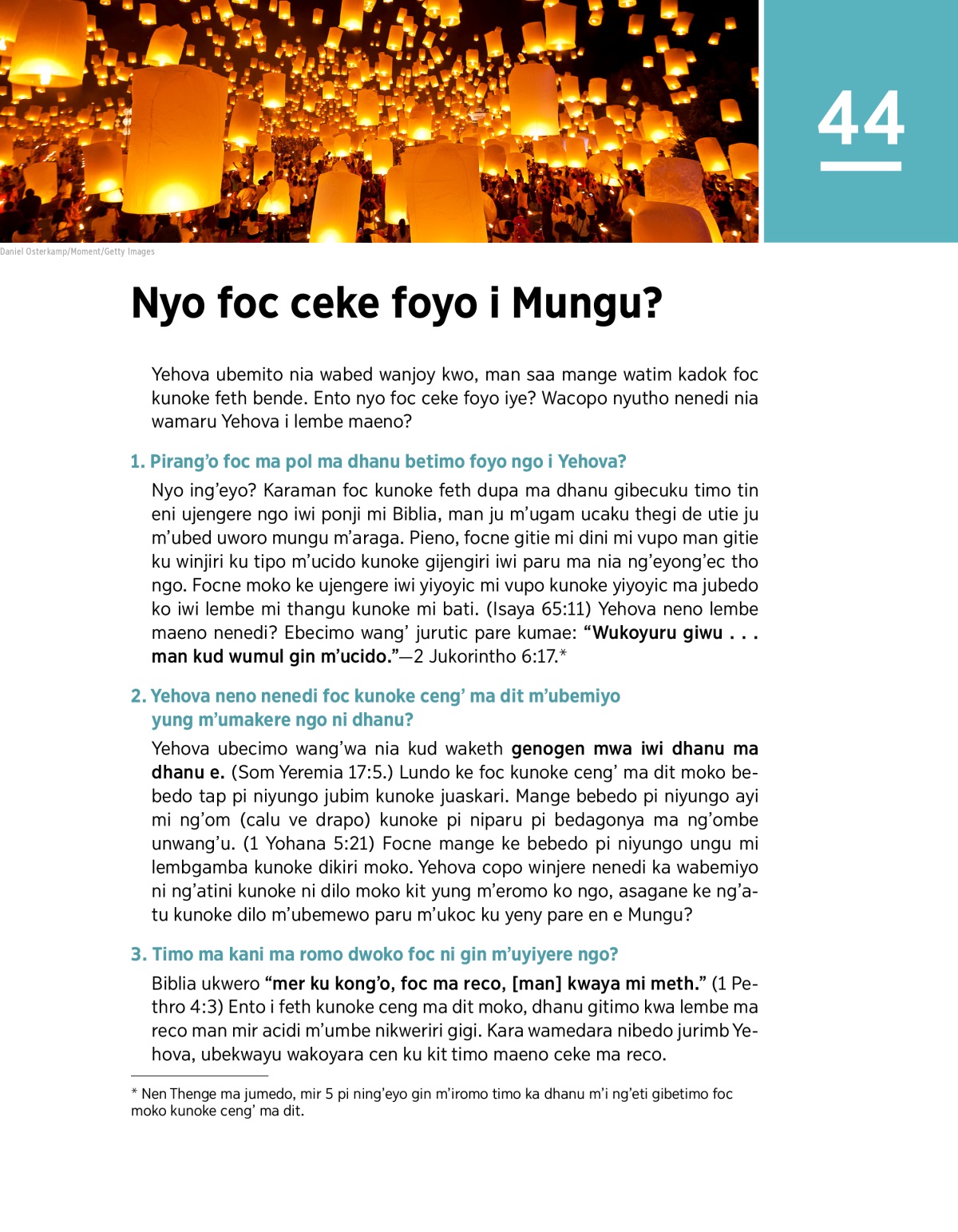 Nyo ing’eyo? Karaman foc kunoke feth dupa ma dhanu gibecuku timo tin eni ujengere ngo iwi ponji mi Biblia, man ju m’ugam ucaku thegi de utie ju m’ubed uworo mungu m’araga. Pieno, focne gitie mi dini mi vupo man gitie ku winjiri ku tipo m’ucido kunoke gijengiri iwi paru ma nia ng’eyong’ec tho ngo. Focne moko ke ujengere iwi yiyoyic mi vupo kunoke yiyoyic ma jubedo ko iwi lembe mi thangu kunoke mi bati. (Isaya 65:11) Yehova neno lembe maeno nenedi? Ebecimo wang’ jurutic pare kumae: “Wukoyuru giwu . . . man kud wumul gin m’ucido.”—2 Jukorintho 6:17.a