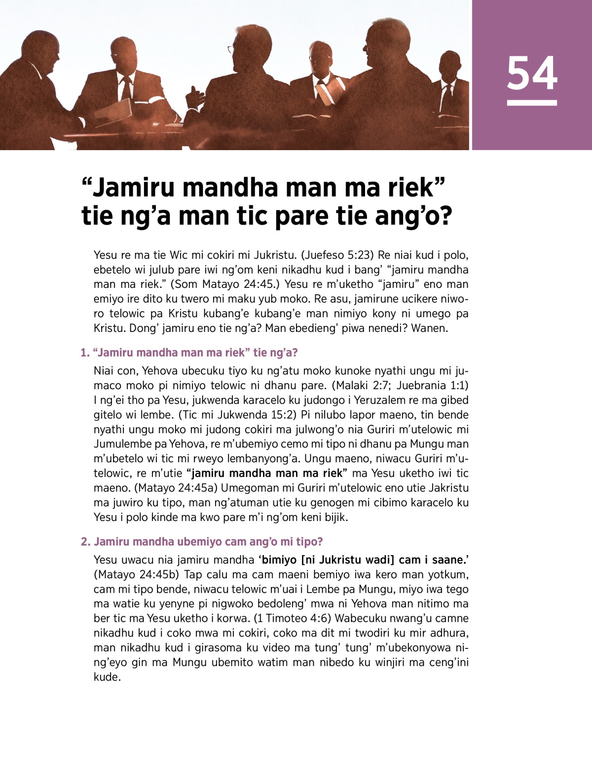 Yesu uwacu nia jamiru mandha ‘bimiyo [ni Jukristu wadi] cam i saane.’ (Matayo 24:45b) Tap calu ma cam maeni bemiyo iwa kero man yotkum, cam mi tipo bende, niwacu telowic m’uai i Lembe pa Mungu, miyo iwa tego ma watie ku yenyne pi nigwoko bedoleng’ mwa ni Yehova man nitimo ma ber tic ma Yesu uketho i korwa. (1 Timoteo 4:6) Wabecuku nwang’u camne nikadhu kud i coko mwa mi cokiri, coko ma dit mi twodiri ku mir adhura, man nikadhu kud i girasoma ku video ma tung’ tung’ m’ubekonyowa ning’eyo gin ma Mungu ubemito watim man nibedo ku winjiri ma ceng’ini kude.