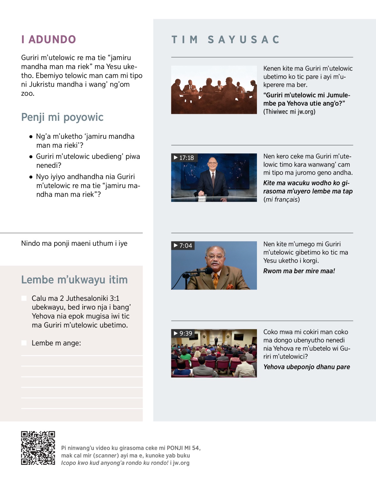 Guriri m’utelowic ubetelo wi tic mi Jumulembe pa Yehova i the loc pa Yesu. Lembene ubetimere calu m’ubed utimere con i rundi mi jukwenda. Nen VIDEO.