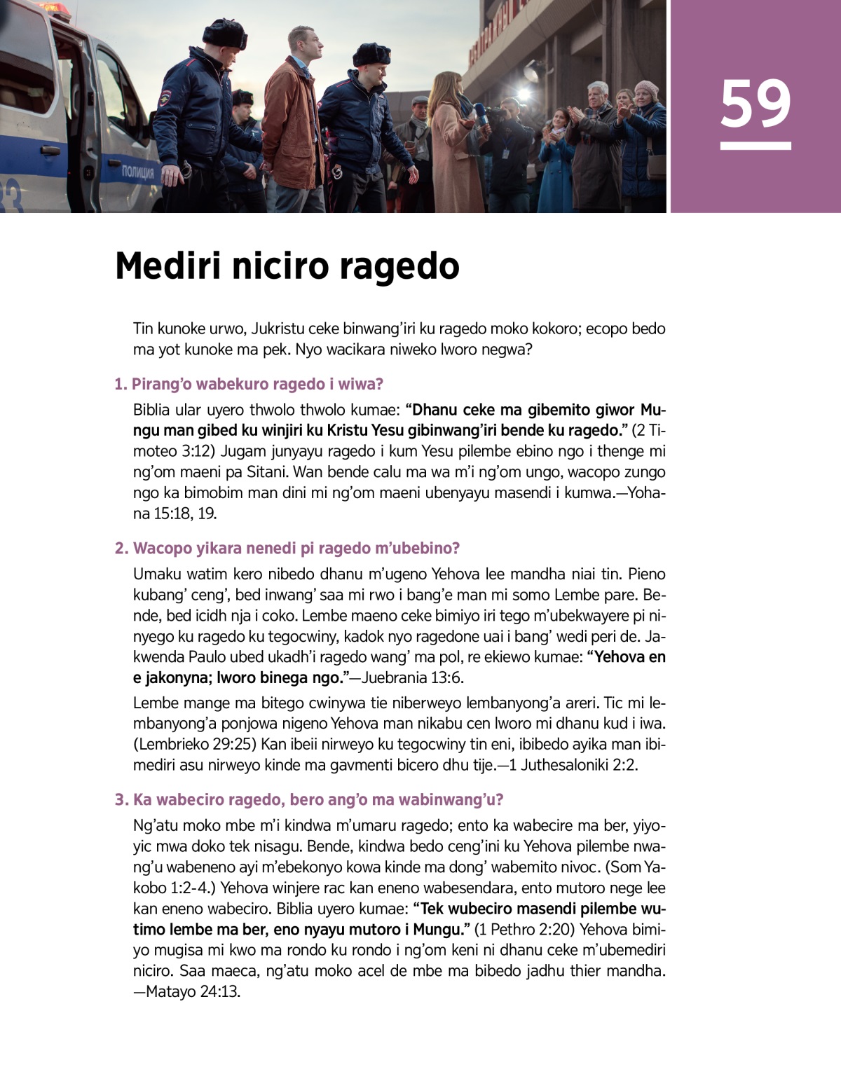 Umaku watim kero nibedo dhanu m’ugeno Yehova lee mandha niai tin. Pieno kubang’ ceng’, bed inwang’ saa mi rwo i bang’e man mi somo Lembe pare. Bende, bed icidh nja i coko. Lembe maeno ceke bimiyo iri tego m’ubekwayere pi ninyego ku ragedo ku tegocwiny, kadok nyo ragedone uai i bang’ wedi peri de. Jakwenda Paulo ubed ukadh’i ragedo wang’ ma pol, re ekiewo kumae: “Yehova en e jakonyna; lworo binega ngo.”—Juebrania 13:6.