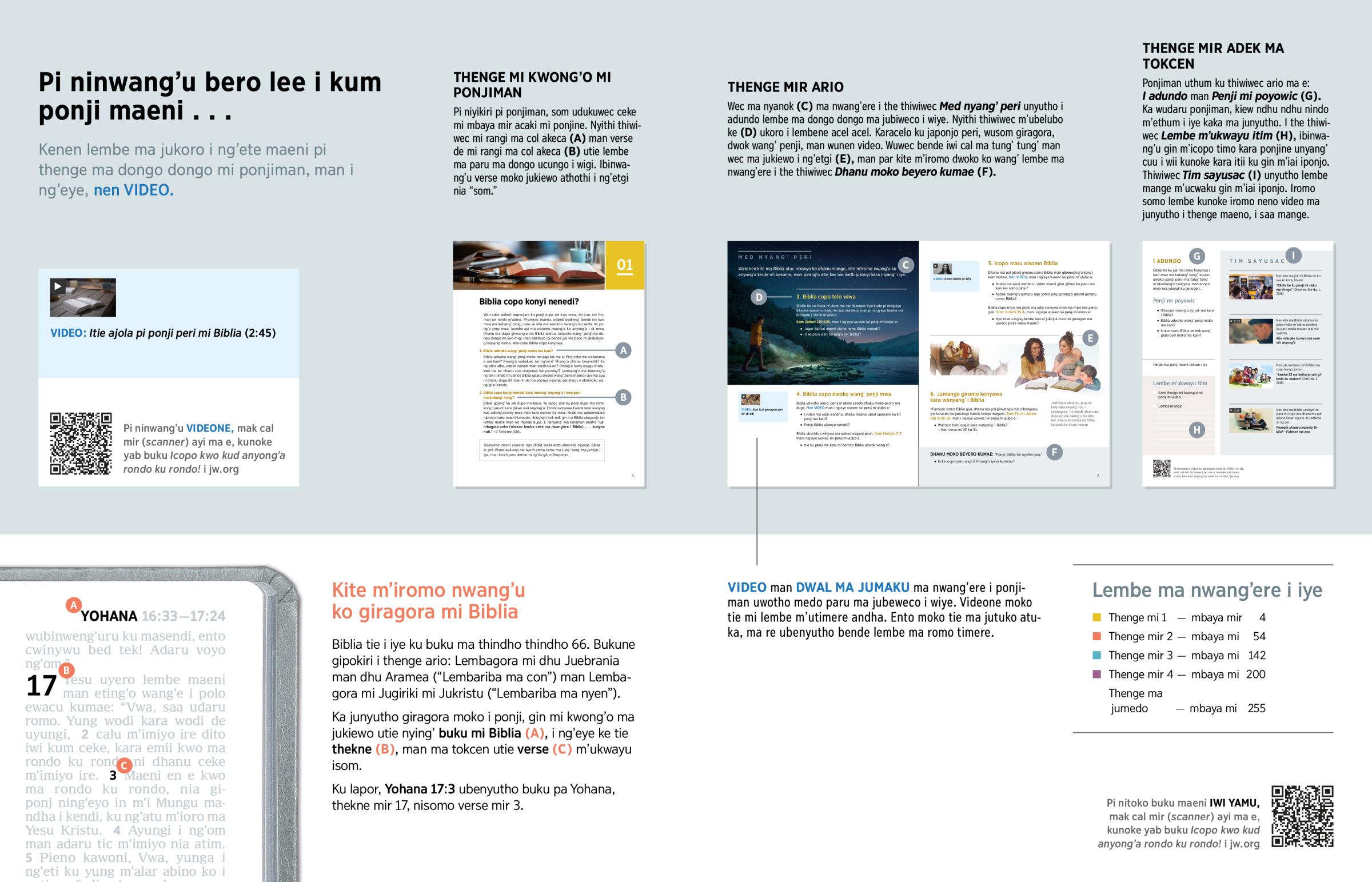 Ka junyutho giragora moko i ponji, gin mi kwong’o ma jukiewo utie nying’ buku mi Biblia (A), i ng’eye ke tie thekne (B), man ma tokcen utie verse (C) m’ukwayu isom.