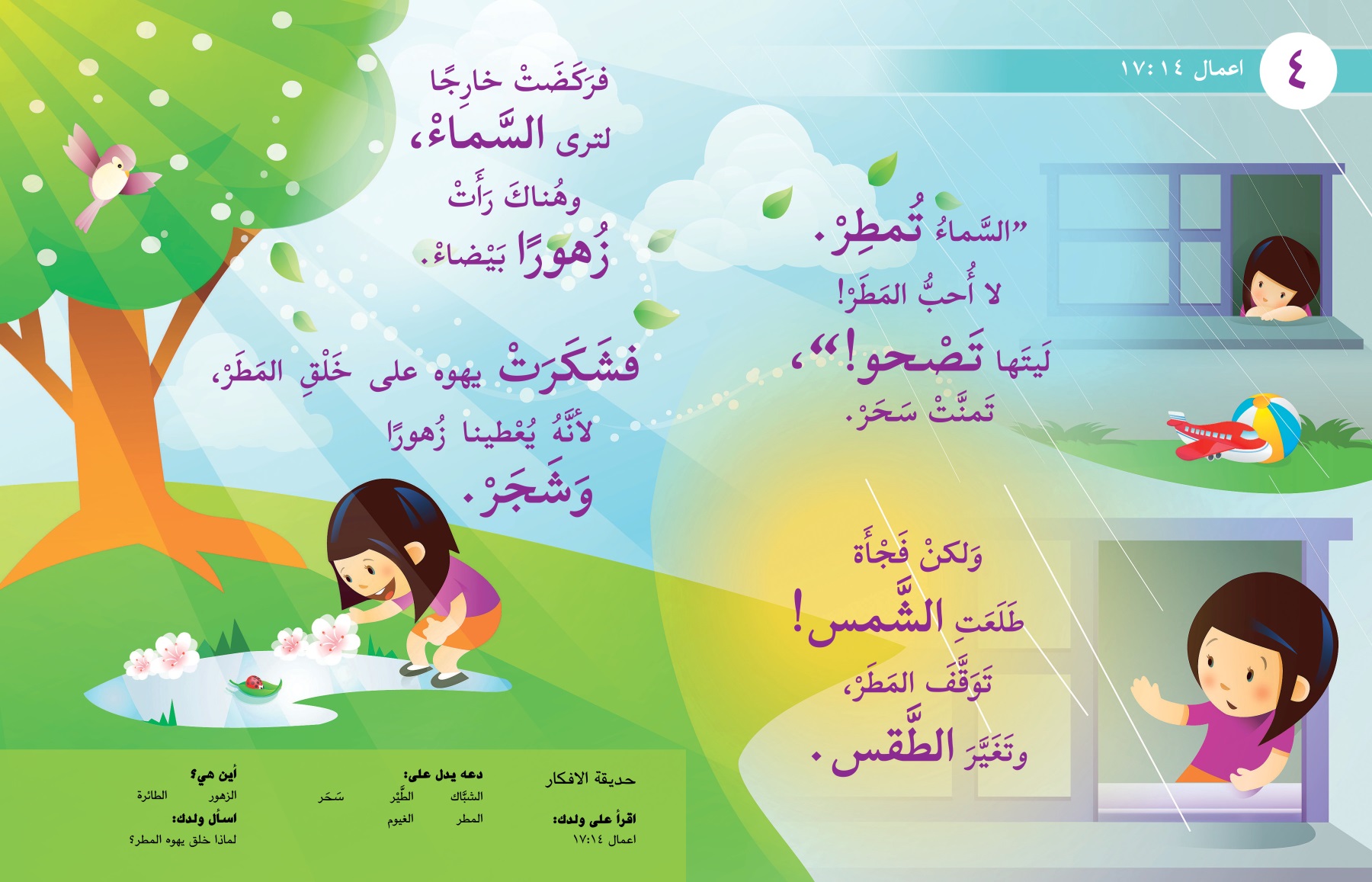 فشَكَرَتْ يهوه على خَلْقِ المَطَرْ، لأنَّهُ يُعْطينا زُهورًا وَشَجَرْ.