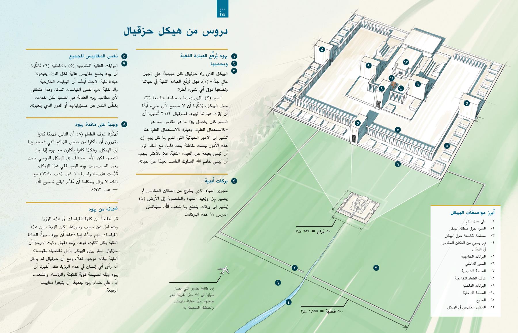 رسم يُظهر أبرز مواصفات هيكل حزقيال،‏ من بينها:‏ ١-‏ على جبل عالٍ.‏ ٢-‏ السور حول منطقة الهيكل.‏ ٣-‏ مساحة شاسعة حول الهيكل.‏ ٤-‏ نهر يخرج من المكان المقدس في الهيكل.‏ ٥-‏ البوابات الخارجية.‏ ٦-‏ السور حول منطقة الهيكل.‏ ٧-‏ الساحة الخارجية.‏ ٨-‏ غرف الطعام الخارجية.‏ ٩-‏ البوابات الداخلية.‏ ١٠-‏ الساحة الداخلية.‏ ١١-‏ المذبح.‏ ١٢-‏ المكان المقدس في الهيكل.‏ تبدو طائرة جامبو (‏التي يصل طولها إلى ٧٥ مترًا تقريبًا)‏ صغيرة جدًّا مقارنة بطول كل جهة من السور حول منطقة الهيكل (‏٥٥٥‏,١ مترًا)‏