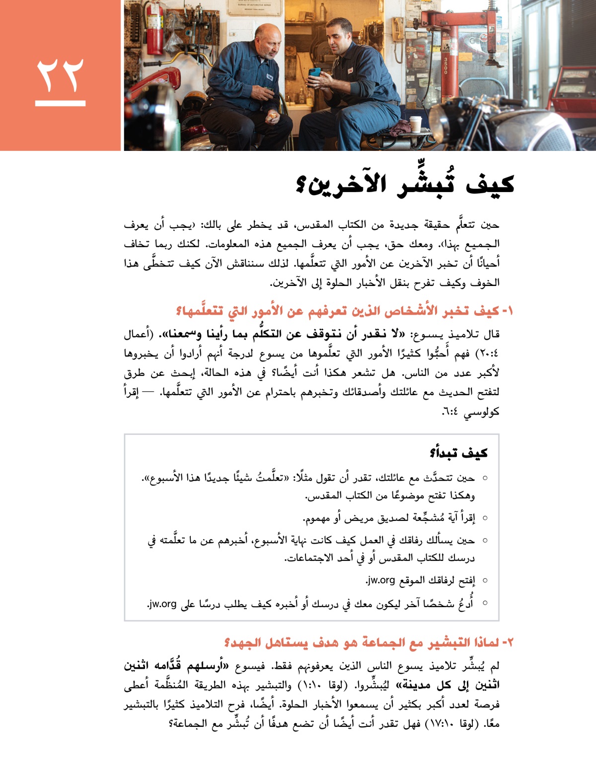 حين يسألك رفاقك في العمل كيف كانت نهاية الأسبوع، أخبرهم عن ما تعلَّمته في درسك للكتاب المقدس أو في أحد الاجتماعات.