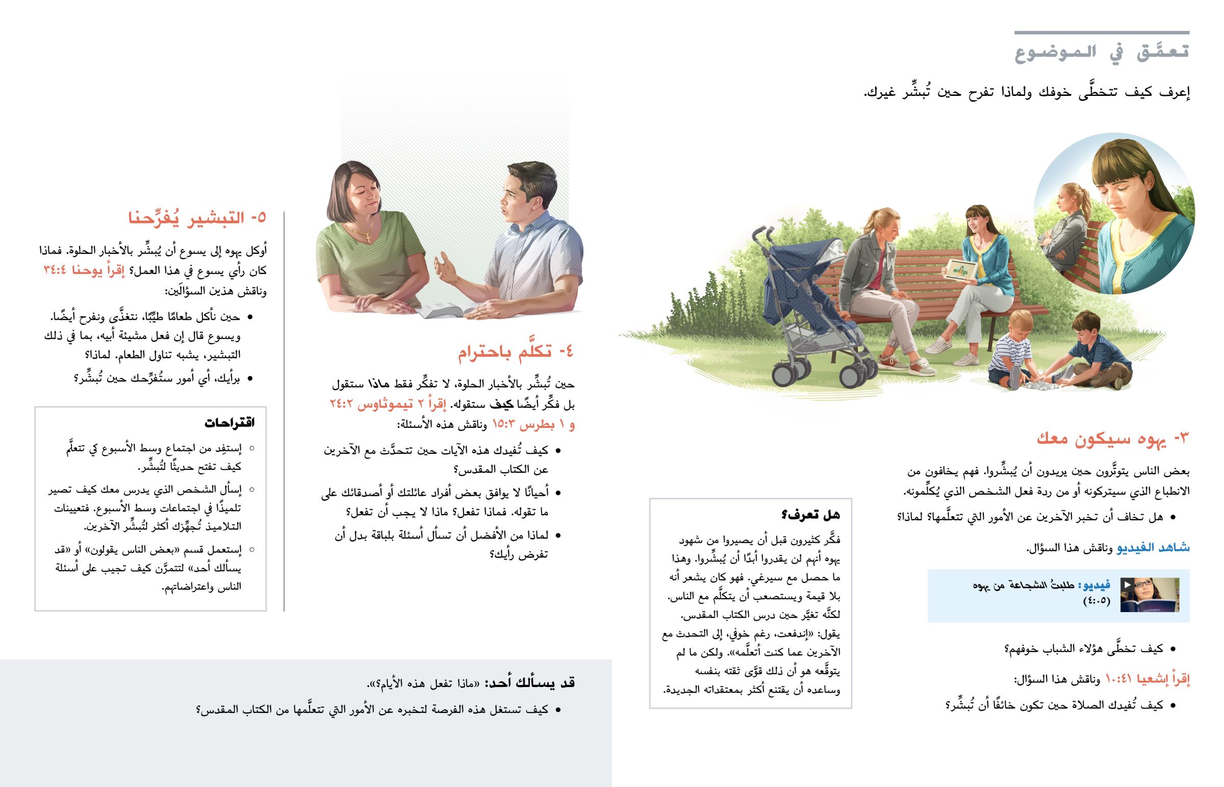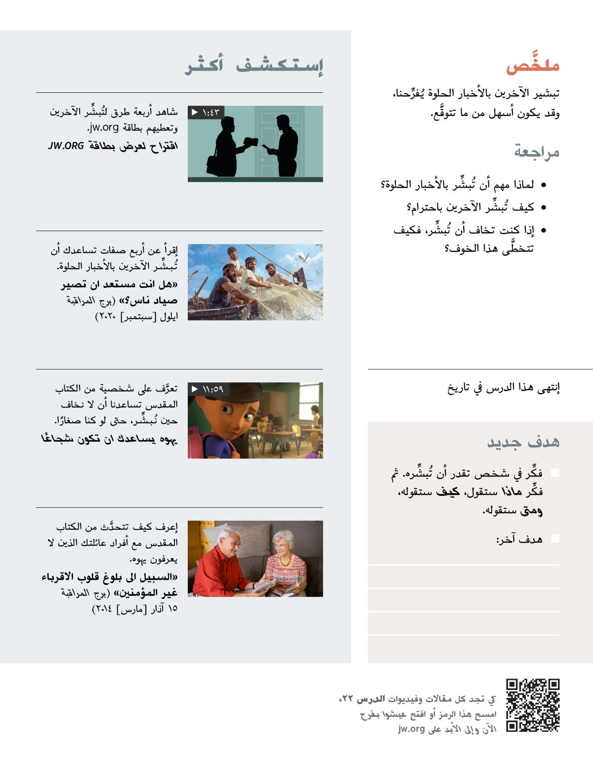 حين تتعلَّم حقيقة جديدة من الكتاب المقدس، قد يخطر على بالك: ‹يجب أن يعرف الجميع بهذا›. ومعك حق، يجب أن يعرف الجميع هذه المعلومات. لكنك ربما تخاف أحيانًا أن تخبر الآخرين عن الأمور التي تتعلَّمها. لذلك سنناقش الآن كيف تتخطَّى هذا الخوف وكيف تفرح بنقل الأخبار الحلوة إلى الآخرين.