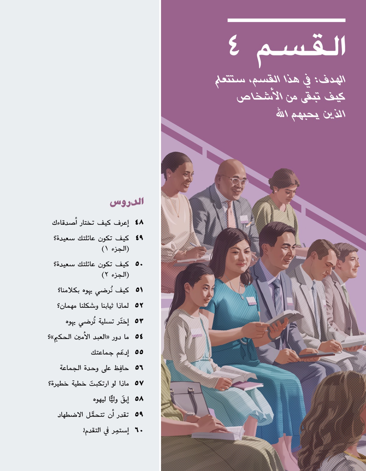 القسم ٤ النسخة المطبوعة الهدف: في هذا القسم، ستتعلم كيف تبقى من الأشخاص الذين يحبهم اللّٰه الدروس ٤٨ إعرف كيف تختار أصدقاءك ٤٩ كيف تكون عائلتك سعيدة؟ (الجزء ١) ٥٠ كيف تكون عائلتك سعيدة؟ (الجزء ٢) ٥١ كيف نُرضي يهوه بكلامنا؟ ٥٢ لماذا ثيابنا وشكلنا مهمان؟ ٥٣ إختَر تسلية تُرضي يهوه ٥٤ ما دور «العبد الأمين الحكيم»؟ ٥٥ إدعَم جماعتك ٥٦ حافِظ على وحدة الجماعة ٥٧ ماذا لو ارتكبتَ خطية خطيرة؟ ٥٨ إبقَ وليًّا ليهوه ٥٩ تقدر أن تتحمَّل الاضطهاد ٦٠ إستمِر في التقدم!