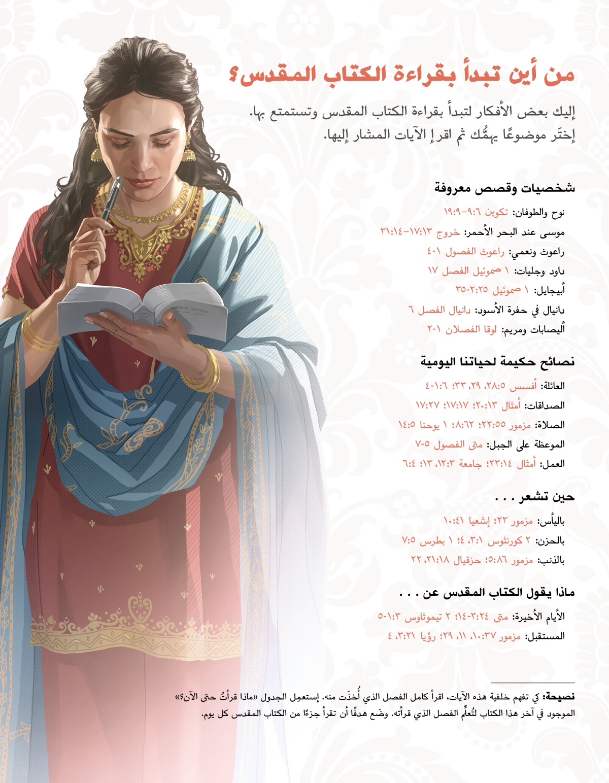 إليك بعض الأفكار لتبدأ بقراءة الكتاب المقدس وتستمتع بها. إختَر موضوعًا يهمُّك ثم اقرإ الآيات المشار إليها.