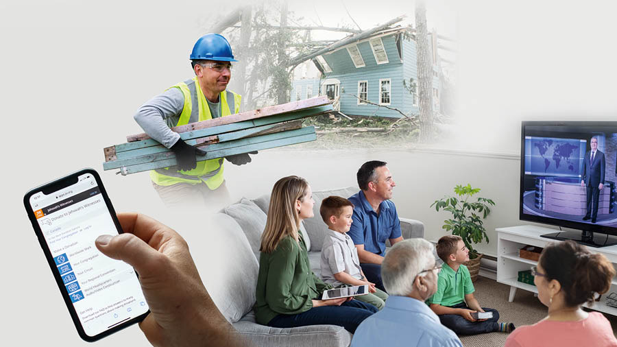 b وصف الصورة: رَغمَ كُلِّ المَسؤوليَّات، أبٌ يُشارِكُ في أعمالِ الإغاثَة، يَدعو زَوجَينِ لِيَحضُرا العِبادَةَ العائِلِيَّةَ مع عائِلَتِه، ويَتَبَرَّعُ لِلعَمَلِ العالَمِيّ.