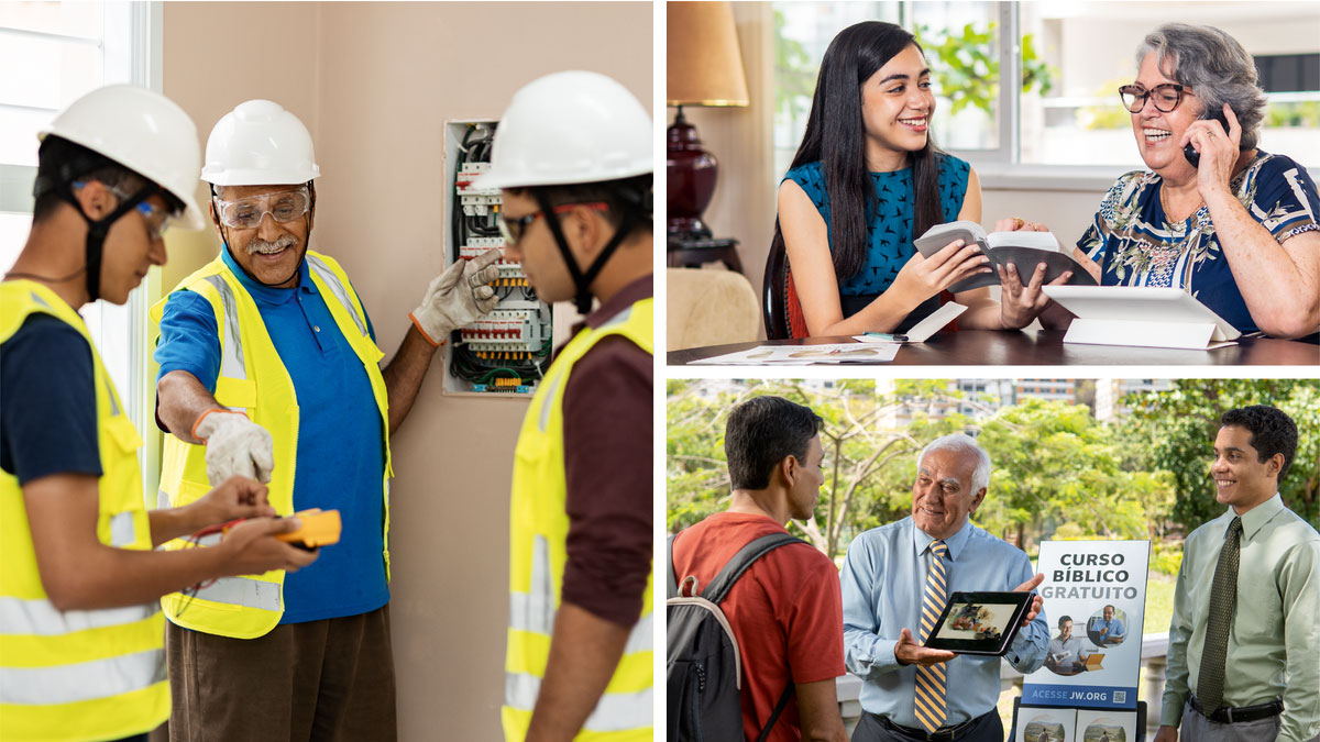e وصف الصورة: أخت شابة تتعلَّم من أخت أكبر سنًّا أن تبشِّر بالتلفون؛ أخ مسن يرسم المثال لأخ شاب في التبشير بشجاعة عند عربة المطبوعات؛ أخ لديه خبرة يدرِّب غيره على صيانة قاعة الملكوت.