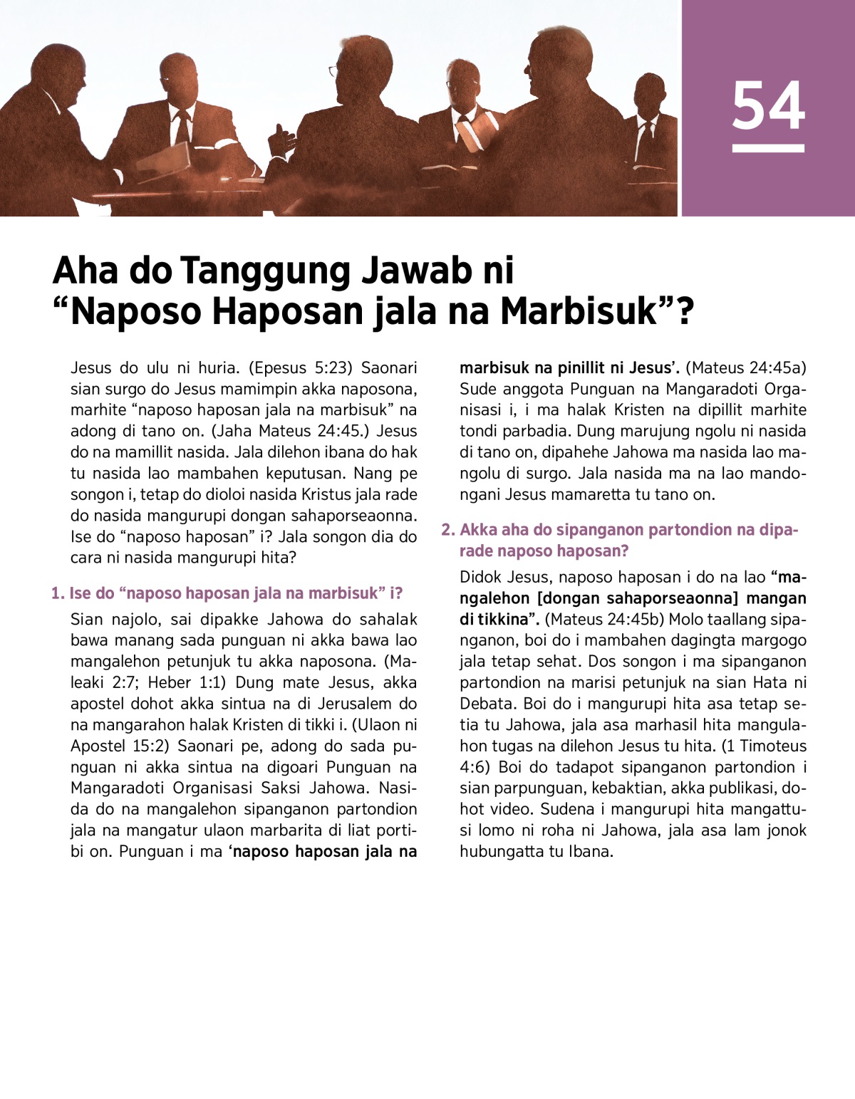 Jesus do ulu ni huria. (Epesus 5:23) Saonari sian surgo do Jesus mamimpin akka naposona, marhite “naposo haposan jala na marbisuk” na adong di tano on. (Jaha Mateus 24:45.) Jesus do na mamillit nasida. Jala dilehon ibana do hak tu nasida lao mambahen keputusan. Nang pe songon i, tetap do dioloi nasida Kristus jala rade do nasida mangurupi dongan sahaporseaonna. Ise do “naposo haposan” i? Jala songon dia do cara ni nasida mangurupi hita?