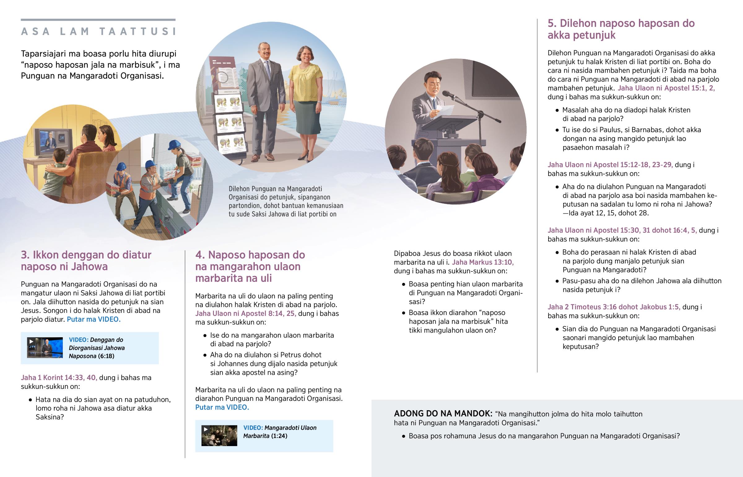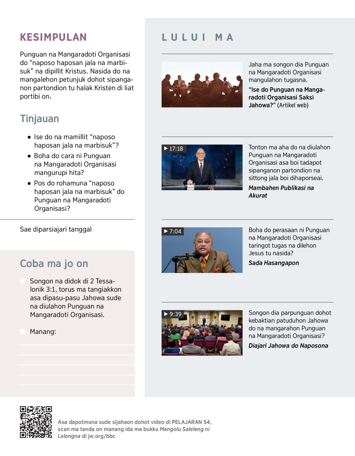 Punguan na Mangaradoti Organisasi do na mangatur ulaon ni Saksi Jahowa di liat portibi on. Jala diihutton nasida do petunjuk na sian Jesus. Songon i do halak Kristen di abad na parjolo diatur. Putar ma VIDEO.