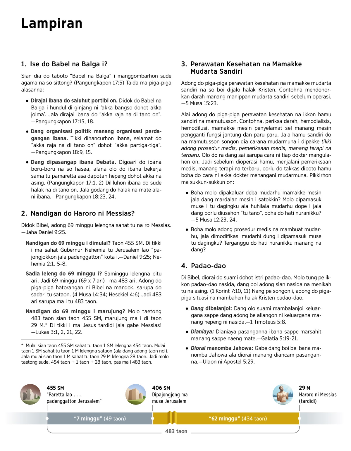 Sadia leleng do 69 minggu i? Saminggu lelengna pitu ari. Jadi 69 minggu (69 x 7 ari) i ma 483 ari. Adong do piga-piga hatorangan ni Bibel na mandok, sarupa do sadari tu sataon. (4 Musa 14:34; Hesekiel 4:6) Jadi 483 ari sarupa ma i tu 483 taon.