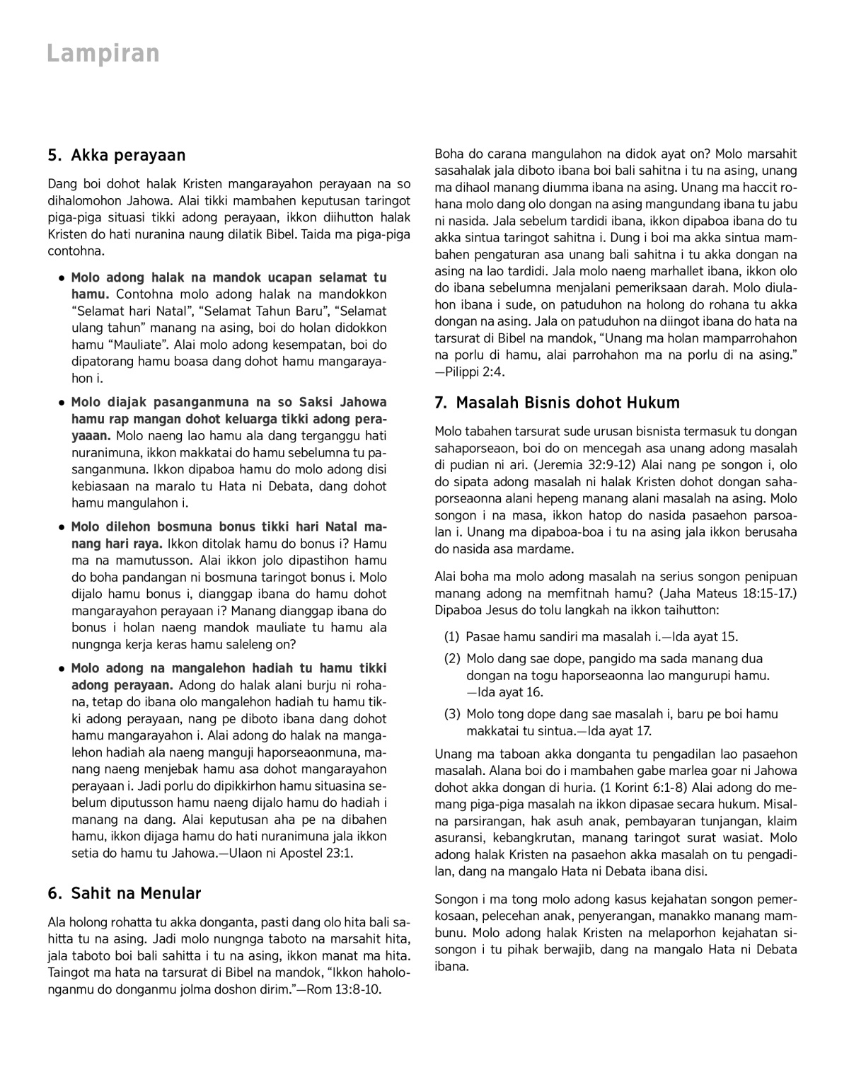 Molo diajak pasanganmuna na so Saksi Jahowa hamu rap mangan dohot keluarga tikki adong perayaaan. Molo naeng lao hamu ala dang terganggu hati nuranimuna, ikkon makkatai do hamu sebelumna tu pasanganmuna. Ikkon dipaboa hamu do molo adong disi kebiasaan na maralo tu Hata ni Debata, dang dohot hamu mangulahon i.