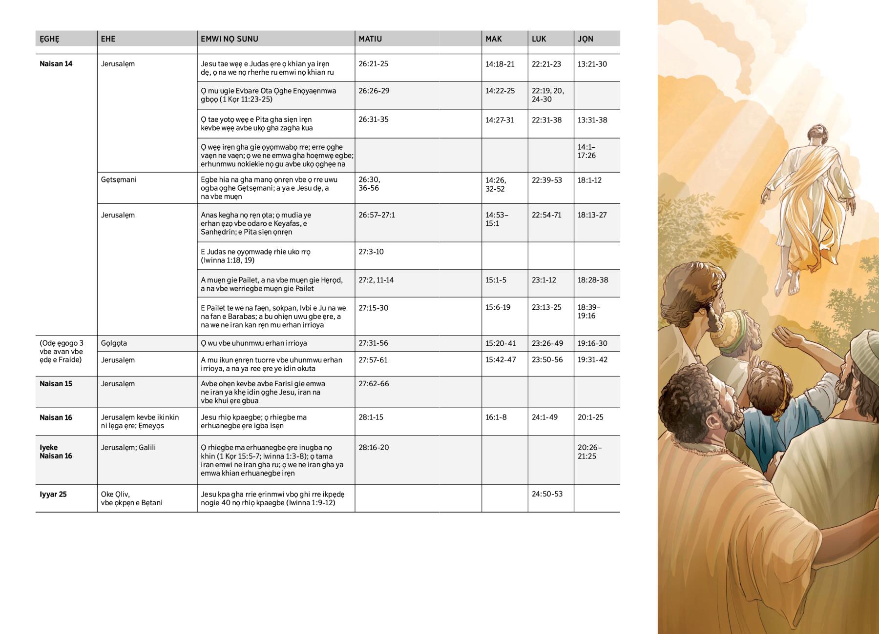 Ọ rhiegbe ma erhuanegbe ẹre inugba nọ khin (1 Kọr 15:5-7; Iwinna 1:3-8); ọ tama iran emwi ne iran gha ru; ọ we ne iran gha ya emwa khian erhuanegbe irẹn |