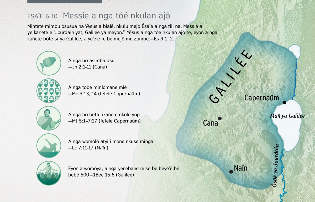 Mintete mimbu ôsusua na Yésus a bialé, nkulu mejô Ésaïe a nga tili na, Messie a ye kañete e “Jourdain yat, Galilée ya meyoñ.” Yésus a nga tôé nkulan ajô te, éyoñ a nga kañete bôte si ya Galilée, a ye’ele fe be mejô me Zambe.—És 9:1, 2.
