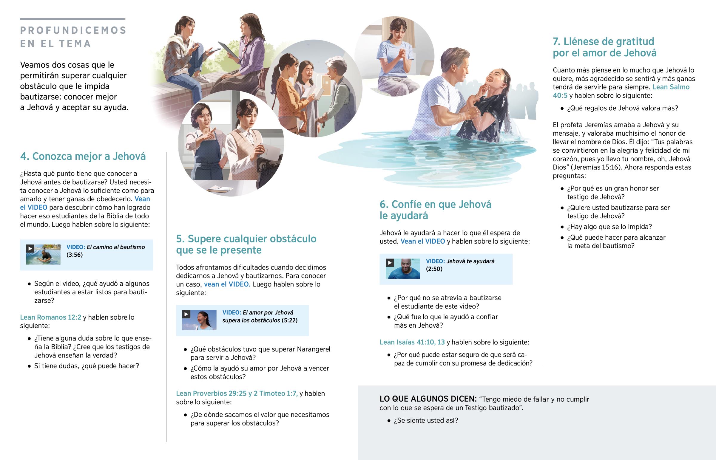 ¿Hasta qué punto tiene que conocer a Jehová antes de bautizarse? Usted necesita conocer a Jehová lo suficiente como para amarlo y tener ganas de obedecerlo. Vean el VIDEO para descubrir cómo han logrado hacer eso estudiantes de la Biblia de todo el mundo. Luego hablen sobre lo siguiente: