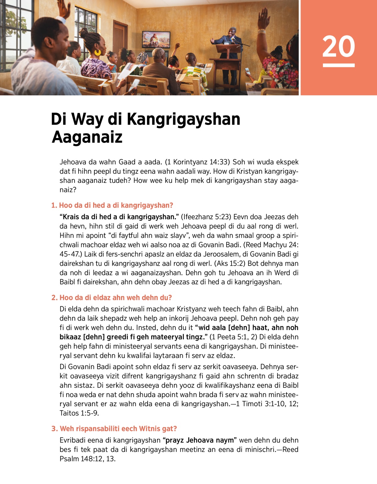 Jehoava da wahn Gaad a aada. (1 Korintyanz 14:33) Soh wi wuda ekspek dat fi hihn peepl du tingz eena wahn aadali way. How di Kristyan kangrigayshan aaganaiz tudeh? How wee ku help mek di kangrigayshan stay aaganaiz?