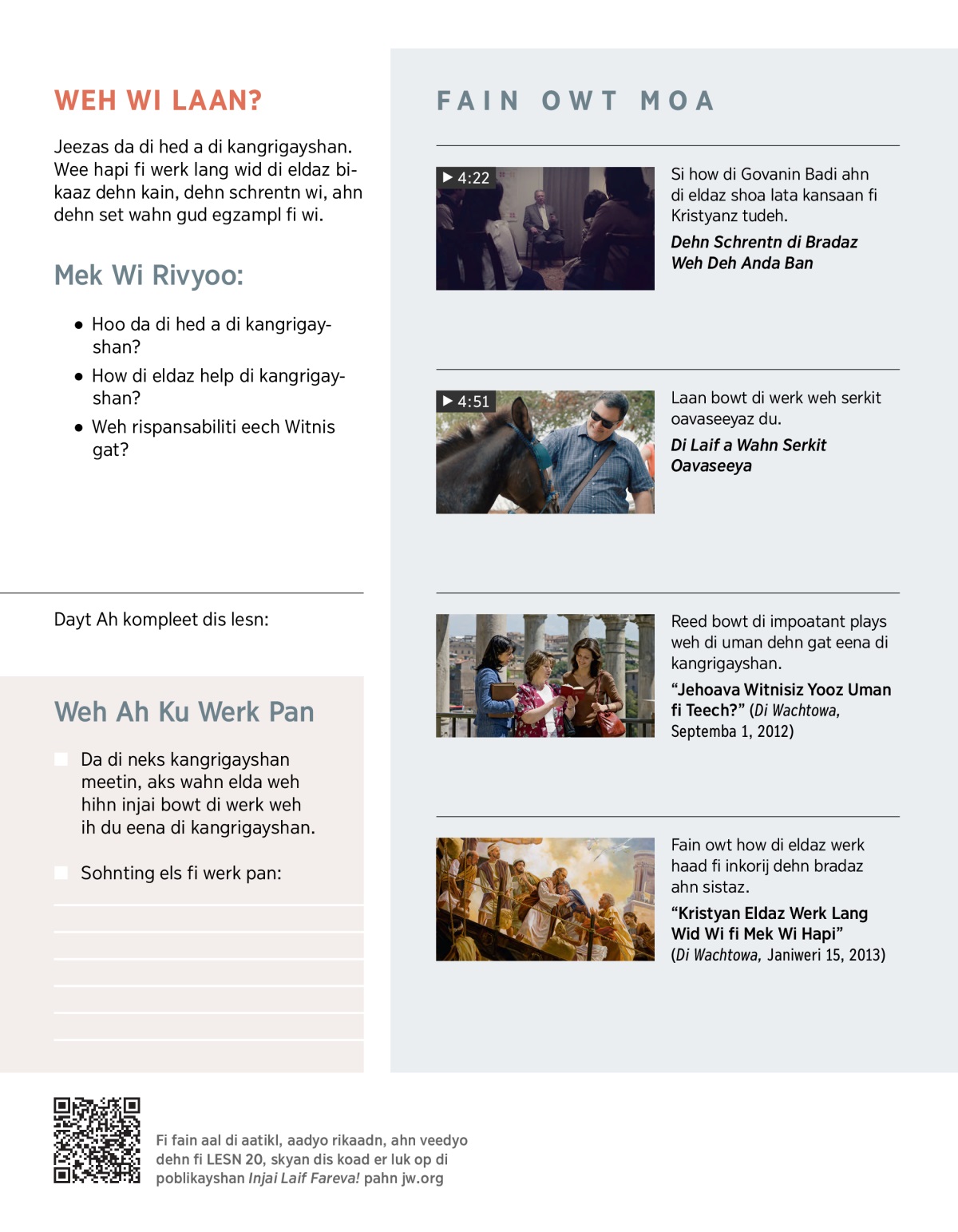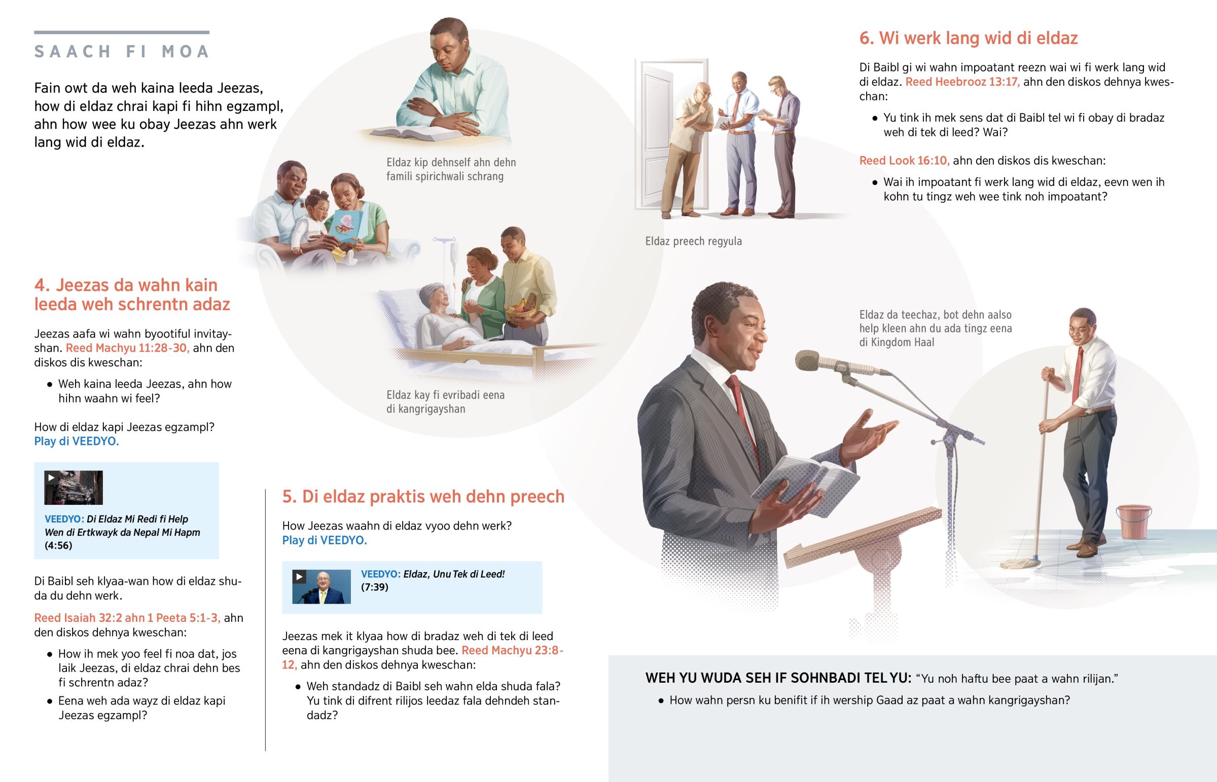 Fain owt da weh kaina leeda Jeezas, how di eldaz chrai kapi fi hihn egzampl, ahn how wee ku obay Jeezas ahn werk lang wid di eldaz.