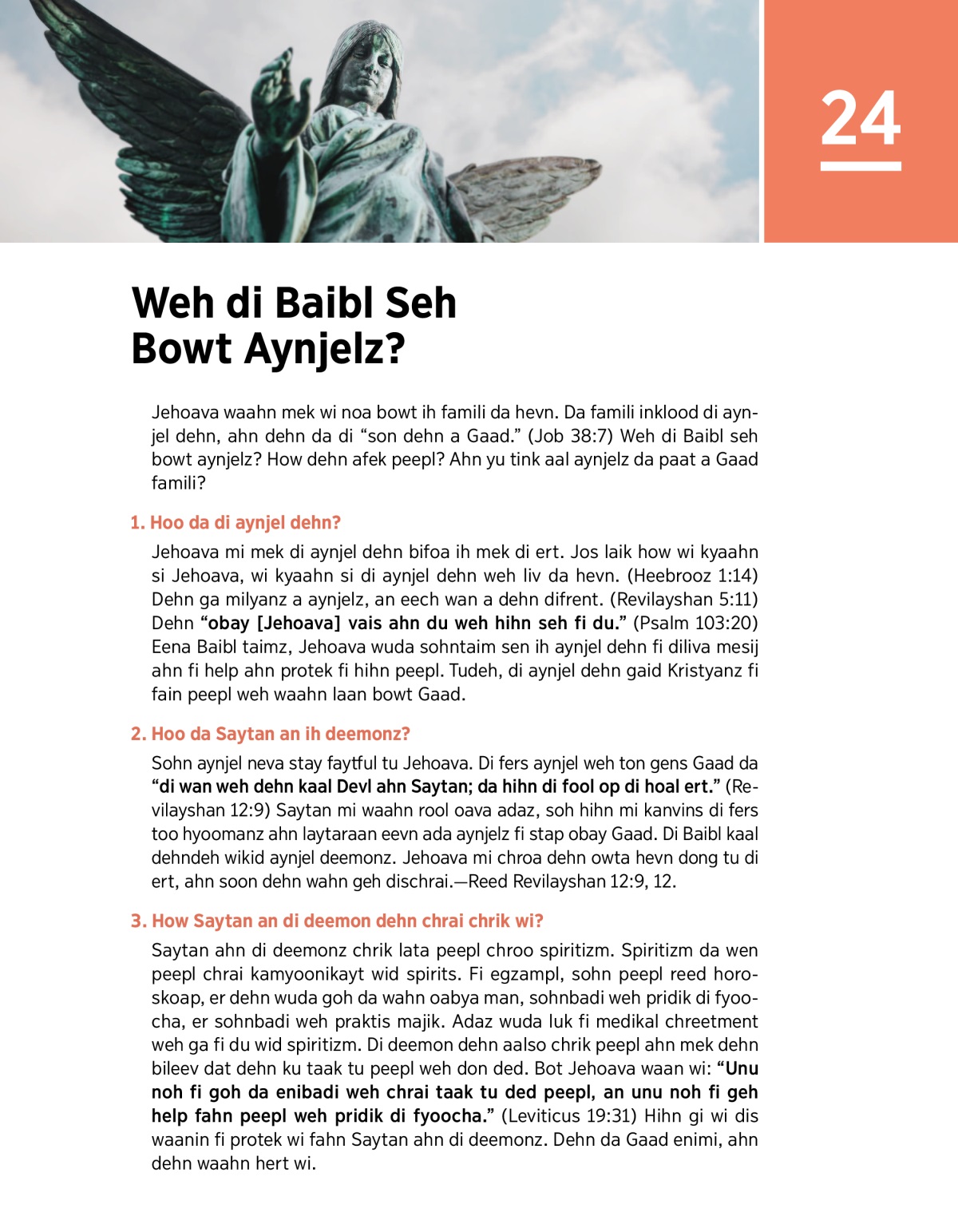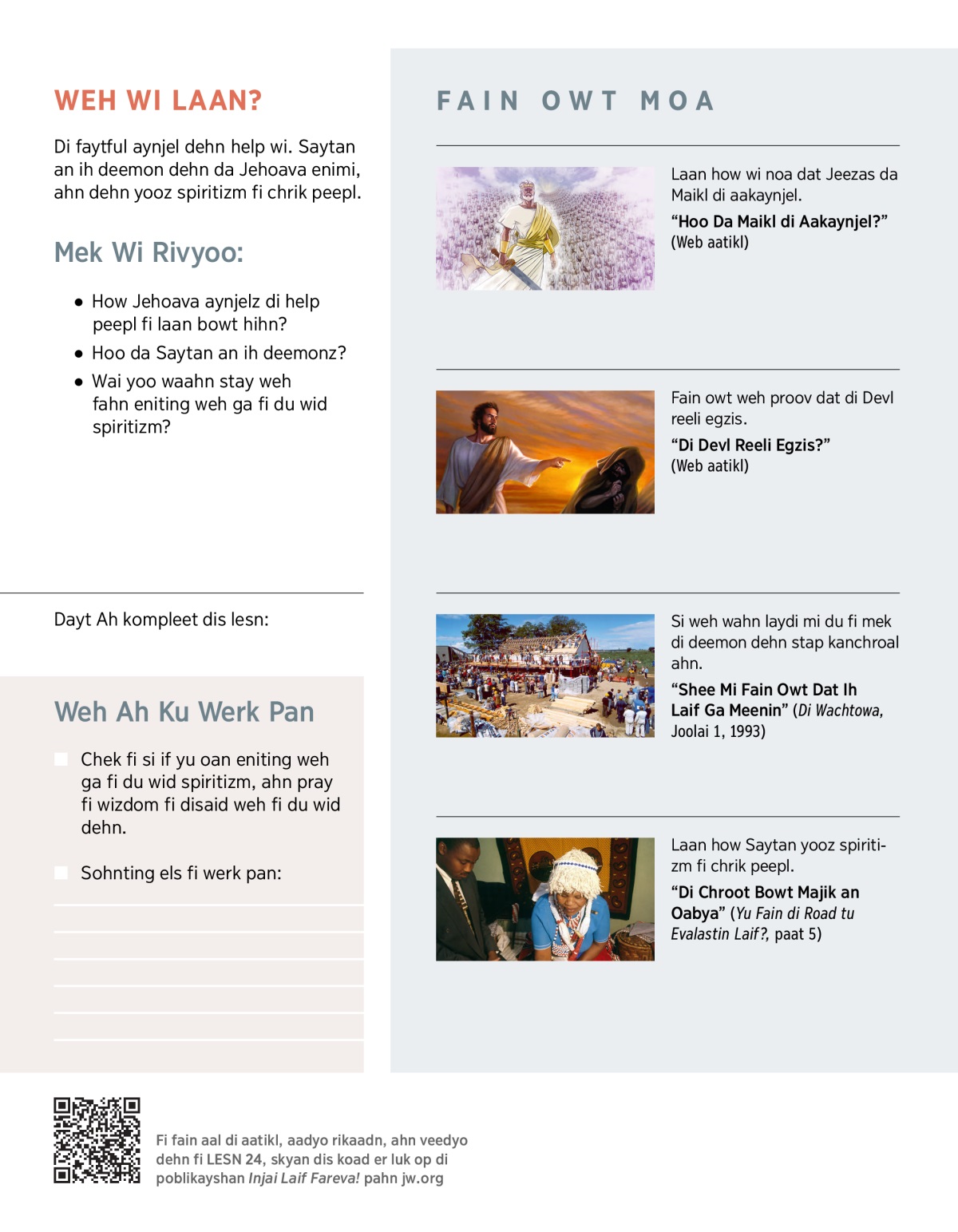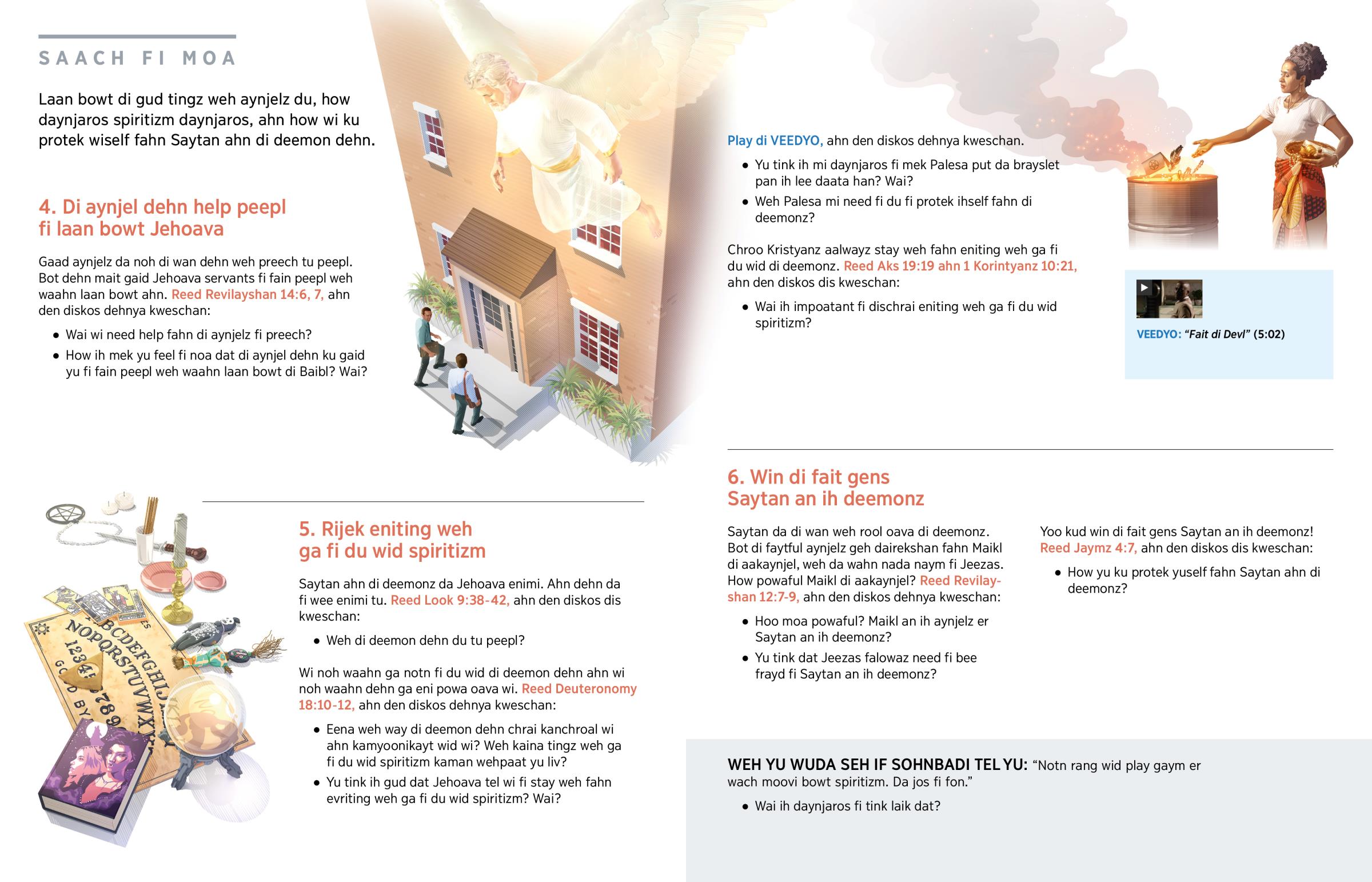 Laan bowt di gud tingz weh aynjelz du, how daynjaros spiritizm daynjaros, ahn how wi ku protek wiself fahn Saytan ahn di deemon dehn.