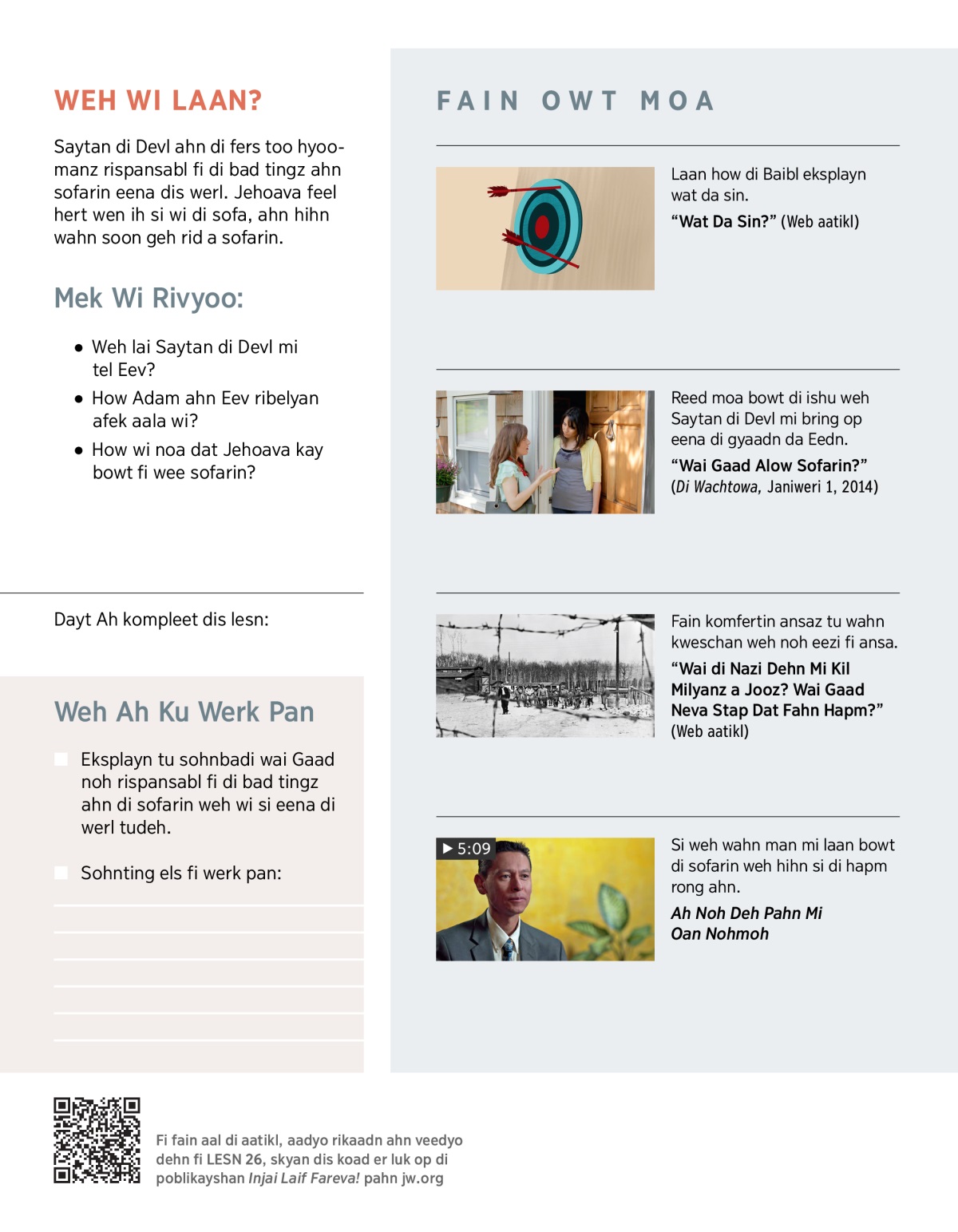 Saytan di Devl ahn di fers too hyoomanz rispansabl fi di bad tingz ahn sofarin eena dis werl. Jehoava feel hert wen ih si wi di sofa, ahn hihn wahn soon geh rid a sofarin.