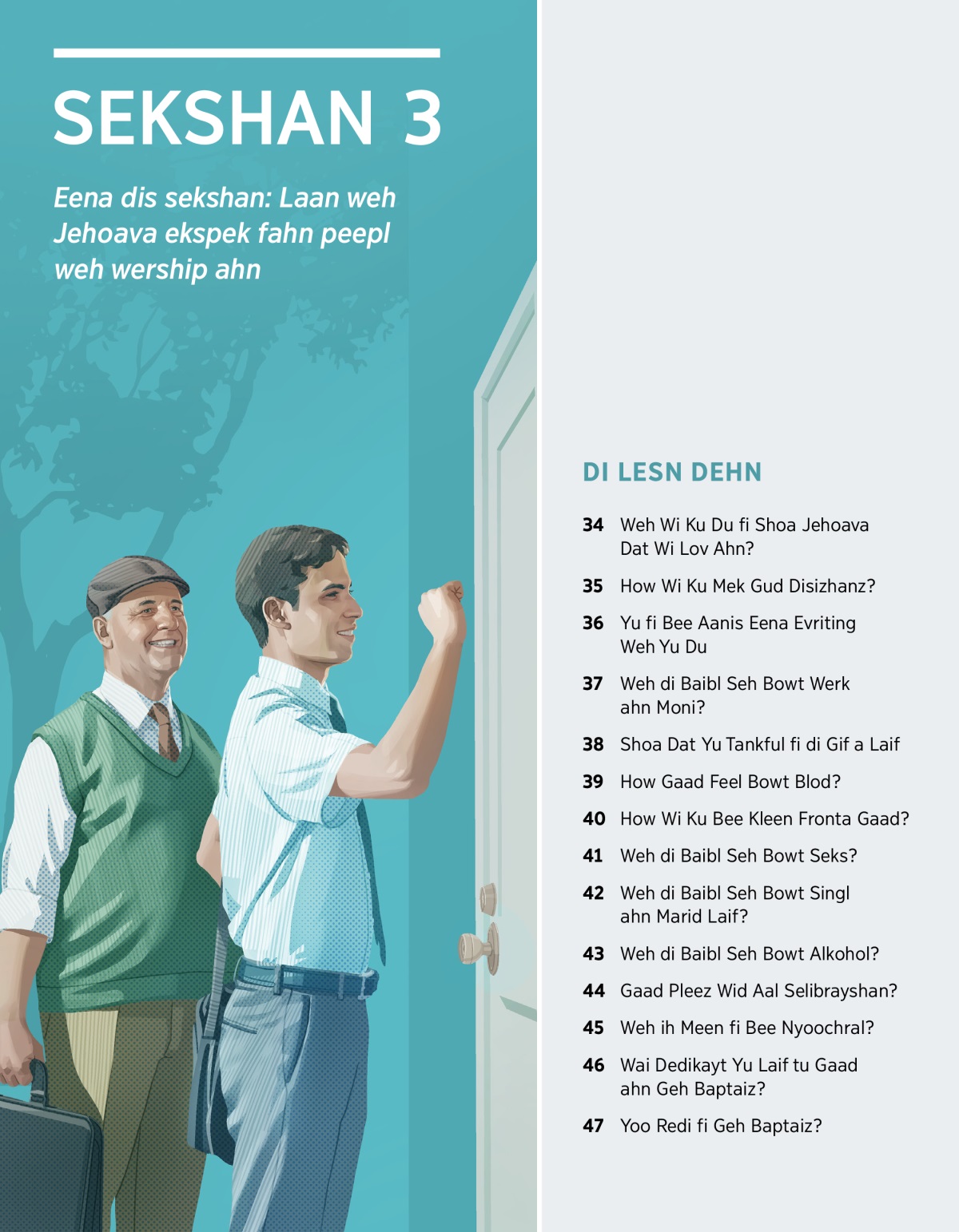 Sekshan 3 Picha Eena dis sekshan: Laan weh Jehoava ekspek fahn peepl weh wership ahn DI LESN DEHN 34 Weh Wi Ku Du fi Shoa Jehoava Dat Wi Lov Ahn? 35 How Wi Ku Mek Gud Disizhanz? 36 Yu fi Bee Aanis Eena Evriting Weh Yu Du 37 Weh di Baibl Seh Bowt Werk ahn Moni? 38 Shoa Dat Yu Tankful fi di Gif a Laif 39 How Gaad Feel Bowt Blod? 40 How Wi Ku Bee Kleen Fronta Gaad? 41 Weh di Baibl Seh Bowt Seks? 42 Weh di Baibl Seh Bowt Singl ahn Marid Laif? 43 Weh di Baibl Seh Bowt Alkohol? 44 Gaad Pleez Wid Aal Selibrayshan? 45 Weh ih Meen fi Bee Nyoochral? 46 Wai Dedikayt Yu Laif tu Gaad ahn Geh Baptaiz? 47 Yoo Redi fi Geh Baptaiz?
