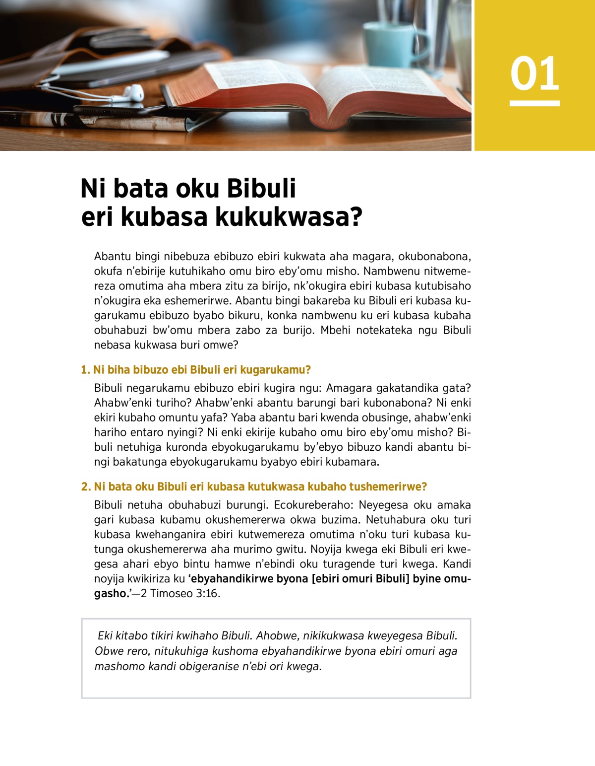 Abantu bingi nibebuza ebibuzo ebiri kukwata aha magara, okubonabona, okufa n’ebirije kutuhikaho omu biro eby’omu misho. Nambwenu nitwemereza omutima aha mbera zitu za birijo, nk’okugira ebiri kubasa kutubisaho n’okugira eka eshemerirwe. Abantu bingi bakareba ku Bibuli eri kubasa kugarukamu ebibuzo byabo bikuru, konka nambwenu ku eri kubasa kubaha obuhabuzi bw’omu mbera zabo za burijo. Mbehi notekateka ngu Bibuli nebasa kukwasa buri omwe?