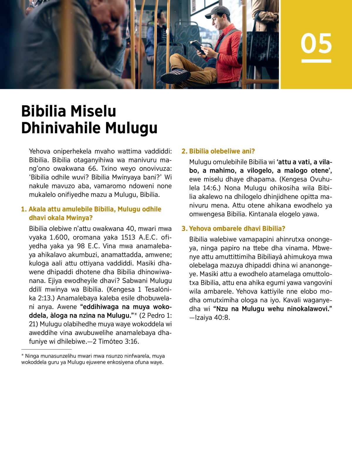 Yehova oniperhekela mvaho wattima vaddiddi: Bibilia. Bibilia otaganyihiwa wa manivuru mang’ono owakwana 66. Txino weyo onovivuza: ‘Bibilia odhile wuvi? Bibilia Mwinyaya bani?’ Wi nakule mavuzo aba, vamaromo ndoweni none mukalelo onifiyedhe mazu a Mulugu, Bibilia.