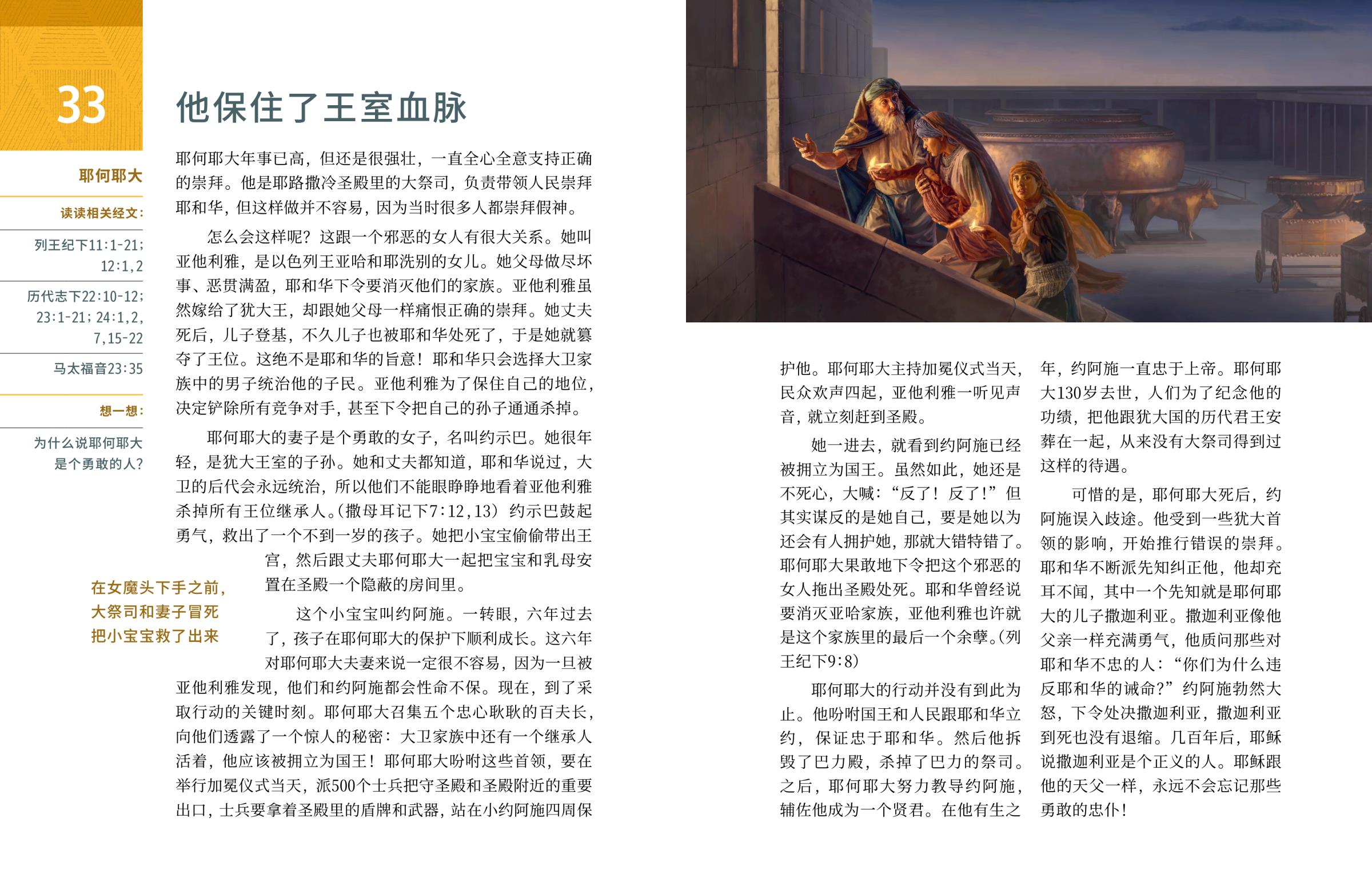 这个小宝宝叫约阿施。一转眼,六年过去了,孩子在耶何耶大的保护下顺利成长。这六年对耶何耶大夫妻来说一定很不容易,因为一旦被亚他利雅发现,他们和约阿施都会性命不保。现在,到了采取行动的关键时刻。耶何耶大召集五个忠心耿耿的百夫长,向他们透露了一个惊人的秘密:大卫家族中还有一个继承人活着,他应该被拥立为国王!耶何耶大吩咐这些首领,要在举行加冕仪式当天,派500个士兵把守圣殿和圣殿附近的重要出口,士兵要拿着圣殿里的盾牌和武器,站在小约阿施四周保护他。耶何耶大主持加冕仪式当天,民众欢声四起,亚他利雅一听见声音,就立刻赶到圣殿。