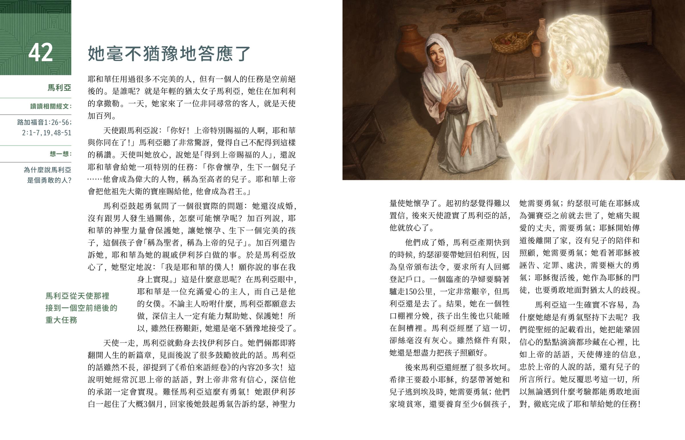 馬利亞鼓起勇氣問了一個很實際的問題:她還沒成婚,沒有跟男人發生過關係,怎麼可能懷孕呢?加百列說,耶和華的神聖力量會保護她,讓她懷孕、生下一個完美的孩子,這個孩子會「稱為聖者,稱為上帝的兒子」。加百列還告訴她,耶和華為她的親戚伊利莎白做的事。於是馬利亞放心了,她堅定地說:「我是耶和華的僕人!願你說的事在我身上實現。」這是什麼意思呢?在馬利亞眼中,耶和華是一位充滿愛心的主人,而自己是他的女僕。不論主人吩咐什麼,馬利亞都願意去做,深信主人一定有能力幫助她、保護她!所以,雖然任務艱鉅,她還是毫不猶豫地接受了。