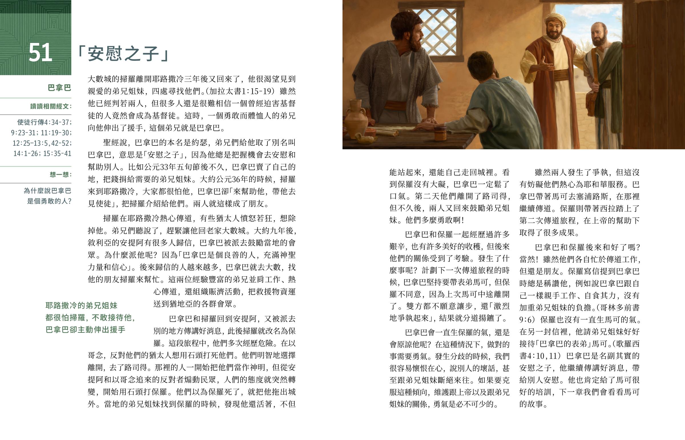 巴拿巴和保羅後來和好了嗎?當然!雖然他們各自忙於傳道工作,但還是朋友。保羅寫信提到巴拿巴時總是稱讚他,例如說巴拿巴跟自己一樣親手工作、自食其力,沒有加重弟兄姐妹的負擔。(哥林多前書9:6)保羅也沒有一直生馬可的氣。在另一封信裡,他請弟兄姐妹好好接待「巴拿巴的表弟」馬可。(歌羅西書4:10,11)巴拿巴是名副其實的安慰之子,他繼續傳講好消息,帶給別人安慰。他也肯定給了馬可很好的培訓,下一章我們會看看馬可的故事。