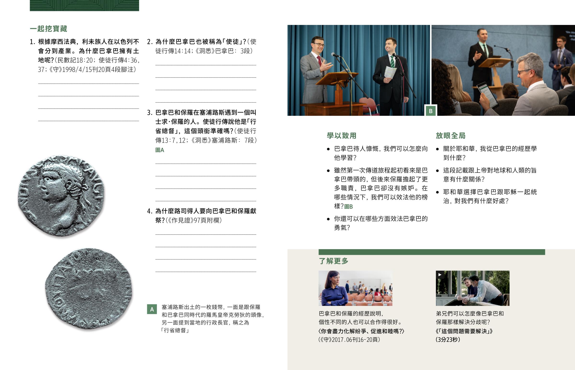 雖然第一次傳道旅程起初看來是巴拿巴帶頭的,但後來保羅擔起了更多職責,巴拿巴卻沒有嫉妒。在哪些情況下,我們可以效法他的榜樣?圖B