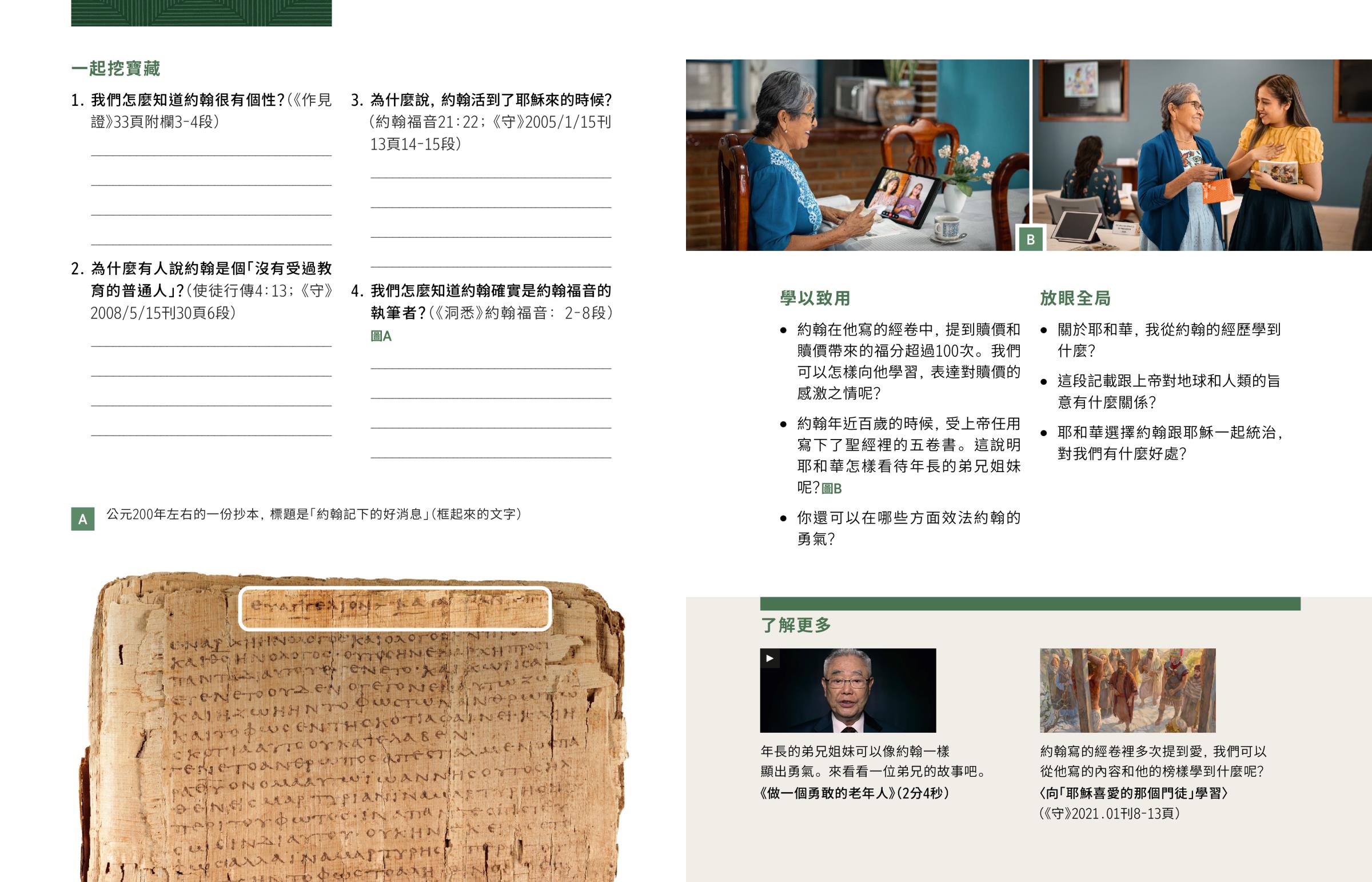 約翰年近百歲的時候,受上帝任用寫下了聖經裡的五卷書。這說明耶和華怎樣看待年長的弟兄姐妹呢?圖B