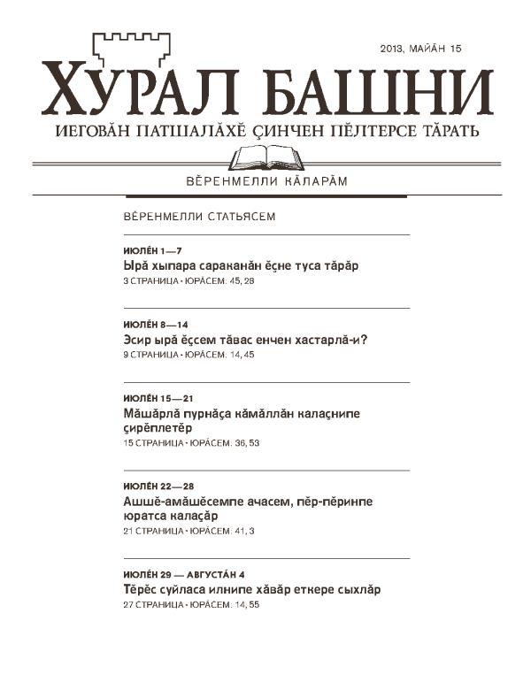 15 Чӑтӑмлӑ пулас тата Иеговӑн организацийӗпе харӑссӑн утас тетпӗр пулсан, Иеговӑна юрӑхлӑ пурӑнмалла пирӗн (Эф. 5:10, 11). Хамӑр ҫитменлӗхсене, Сатанапа унӑн йӗркесӗр тӗнчи витӗм кӳнине пула тӗрӗссине тума пире питӗ йывӑр пулма пултарать. Сирӗнтен камӑн та пулин, хаклӑ тӑванӑмӑрсем, Иеговӑпа хӑвӑр хушӑри туслӑха упраса хӑварас тесе кашни кун ҫине тӑрса кӗрешме тивет. Иегова эсир вӑй хунине курать тата сире питӗ хытӑ юратать. Ан парӑнӑр! Иеговӑна юрӑхлӑ пурӑнни пирӗн кӑмӑла ҫырлахтарать тата эпир Турра пуҫҫапни нихӑҫан кӑлӑхах пулмӗ тесе шантарать (1 Кор. 9:24—27).