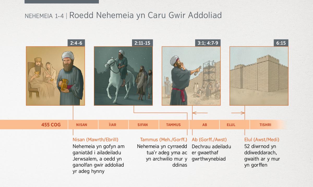2:4-6 Nehemeia yn gofyn am ganiatâd i ailadeiladu Jerwsalem, a oedd yn ganolfan gwir addoliad yr adeg hynny
