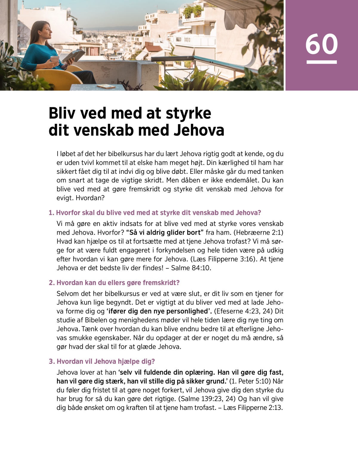 Selvom det her bibelkursus er ved at være slut, er dit liv som en tjener for Jehova kun lige begyndt. Det er vigtigt at du bliver ved med at lade Jehova forme dig og ‘ifører dig den nye personlighed’. (Efeserne 4:23, 24) Dit studie af Bibelen og menighedens møder vil hele tiden lære dig nye ting om Jehova. Tænk over hvordan du kan blive endnu bedre til at efterligne Jehovas smukke egenskaber. Når du opdager at der er noget du må ændre, så gør hvad der skal til for at glæde Jehova.