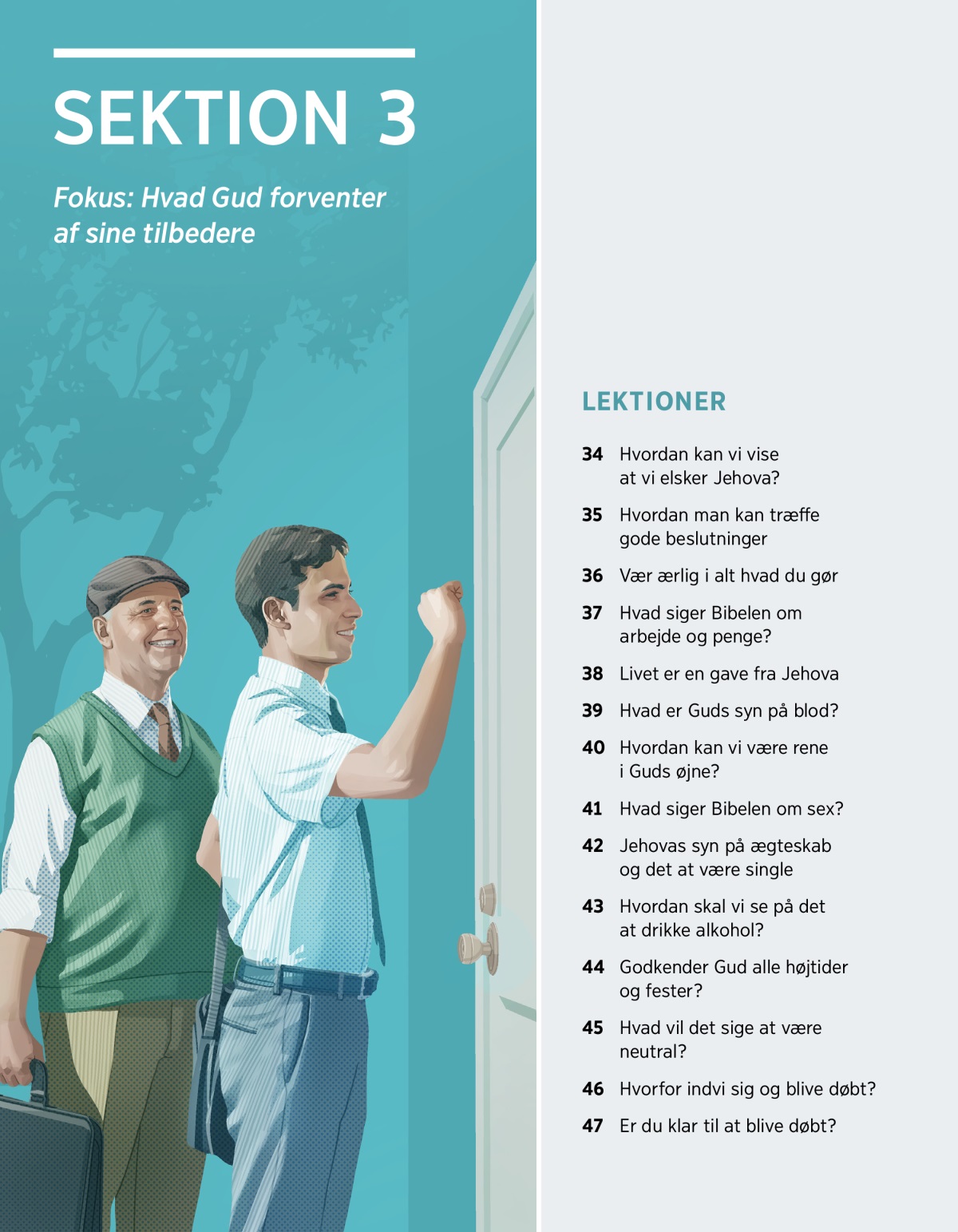 Sektion 3 Trykt udgave Fokus: Hvad Gud forventer af sine tilbedere LEKTIONER 34 Hvordan kan vi vise at vi elsker Jehova? 35 Hvordan man kan træffe gode beslutninger 36 Vær ærlig i alt hvad du gør 37 Hvad siger Bibelen om arbejde og penge? 38 Livet er en gave fra Jehova 39 Hvad er Guds syn på blod? 40 Hvordan kan vi være rene i Guds øjne? 41 Hvad siger Bibelen om sex? 42 Jehovas syn på ægteskab og det at være single 43 Hvordan skal vi se på det at drikke alkohol? 44 Godkender Gud alle højtider og fester? 45 Hvad vil det sige at være neutral? 46 Hvorfor indvi sig og blive døbt? 47 Er du klar til at blive døbt?