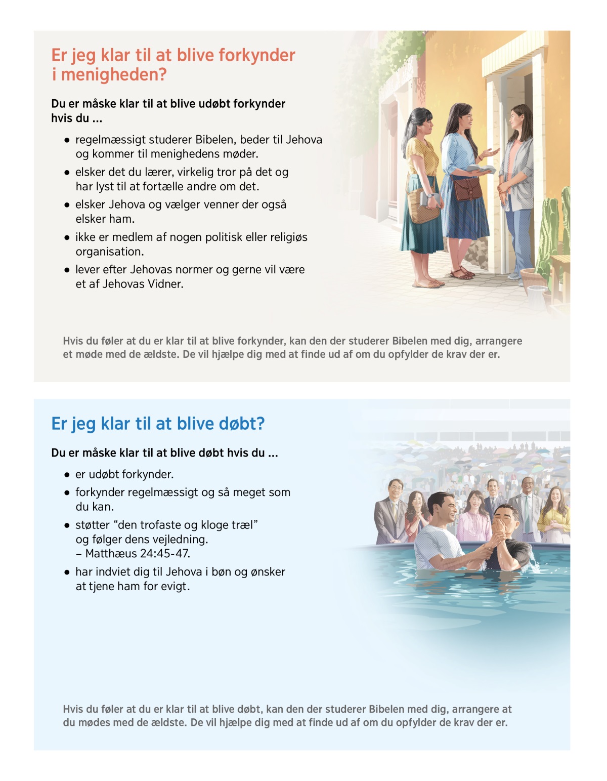 Hvis du føler at du er klar til at blive forkynder, kan den der studerer Bibelen med dig, arrangere et møde med de ældste. De vil hjælpe dig med at finde ud af om du opfylder de krav der er.