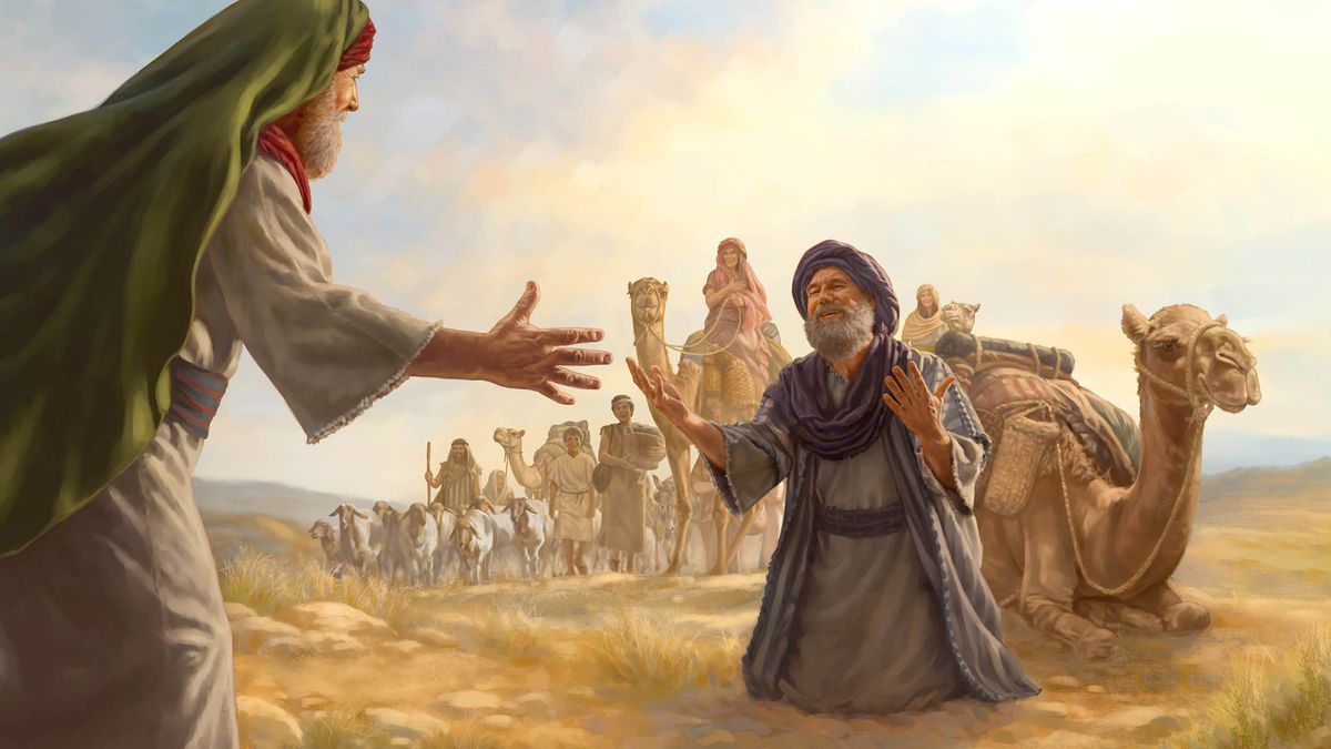 Efter det haltede Jakob tilbage til sin familie. I det fjerne kunne han nu se Esau nærme sig med sine 400 mænd, og han gik alene ud for at møde dem. Mens han nærmede sig Esau, bøjede han sig til jorden syv gange. Så løb Esau hen imod ham, men han trak ikke noget våben. I stedet åbnede han sine arme og omfavnede Jakob! De to brødre kunne ikke holde tårerne tilbage. Jakobs gavmilde gaver og hans ydmyge indstilling havde tydeligvis blødgjort Esau. Og hans mod havde måske også gjort indtryk på ham. Det var lykkedes Jakob at skabe fred med sin bror.