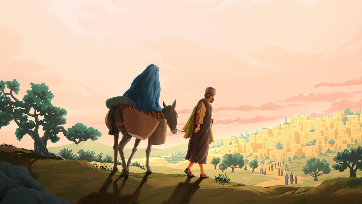 Inden længe befalede kejser Augustus at indbyggerne i hele riget skulle registreres, og Josef måtte derfor rejse til Betlehem. Vi ved ikke om det var et krav at Maria tog med, men uanset hvad følte Josef sikkert at han bedre kunne beskytte hende hvis de blev sammen. Så de begav sig ud på den lange rejse – selvom Maria “var højgravid”. Da de var ankommet til Betlehem, begyndte Marias veer, og hun endte med at føde i en stald.